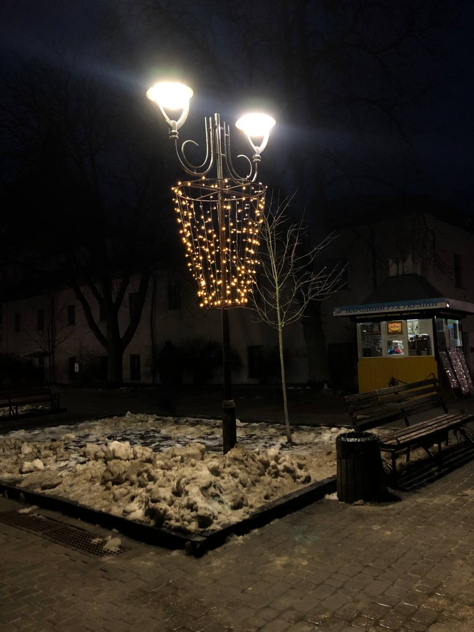 Навіть стовпчики деяких ліхтариків поблизу Кафедрального собору прикрашені ілюмінаціями і нагадують про прийдешні свята.