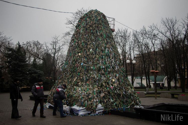 У місті Миколаїв справжня фронтова ялинка, адже зроблена вона з мішків з піском та маскувальної сітки. Основою для ялинки став пам'ятник покровителю міста, Святому Миколаю, який ще у жовтні закрили від обстрілів мішками з піском.
