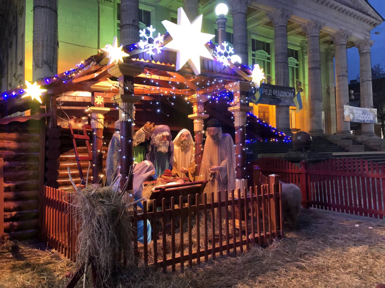 Різдвяна шопка також прикрашена ілюмінаціями, тож навіть ввечері можна розгледіти кожного героя та справжніх маленьких баранчиків.
