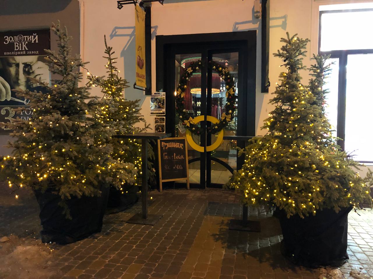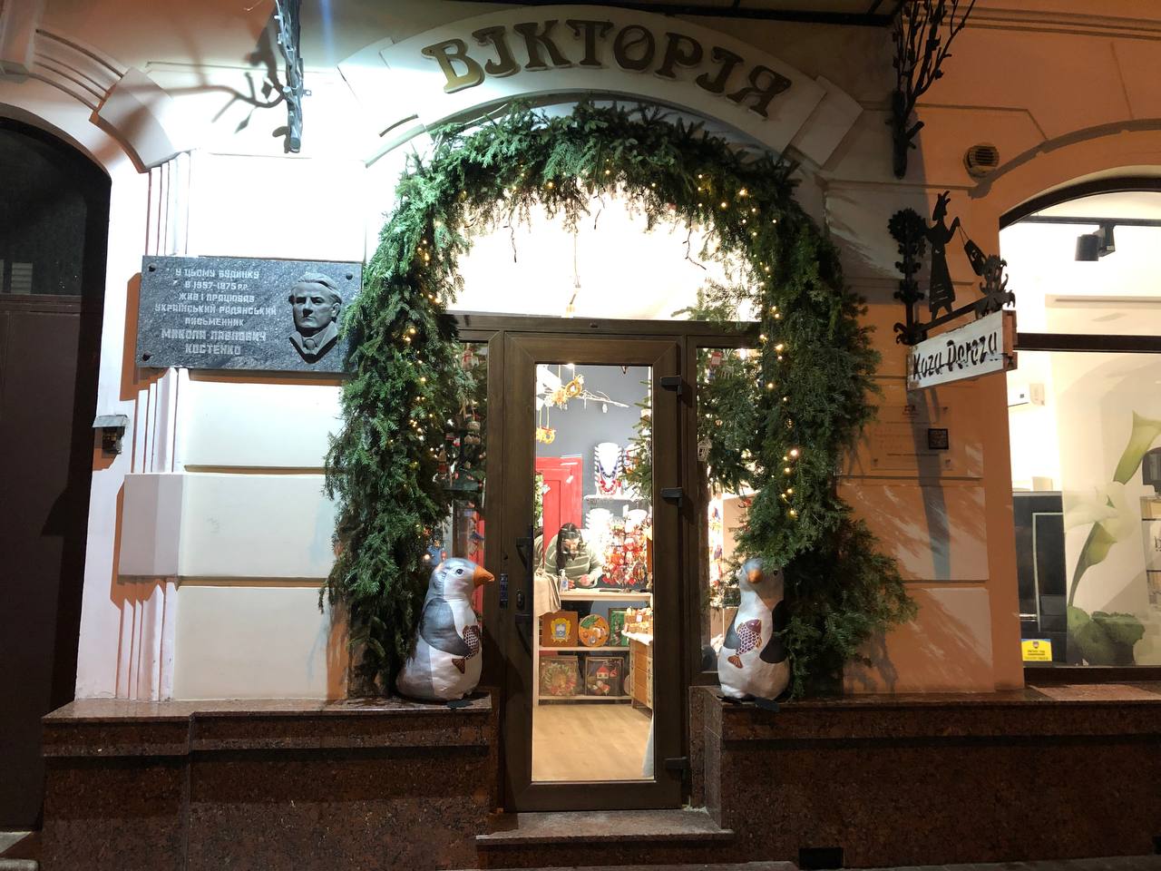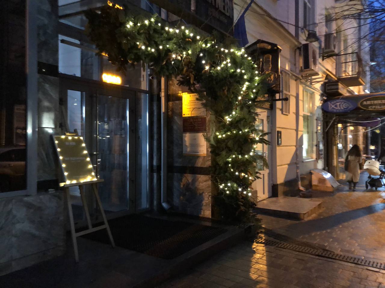 Також кілька закладів прикрасили вхідні двері різдвяними вінками з різноманітними іграшками або ж просто ялинковими гілочками з гірляндами. Деякі навіть встановили біля вхідних дверей казоквих пінгвінів.