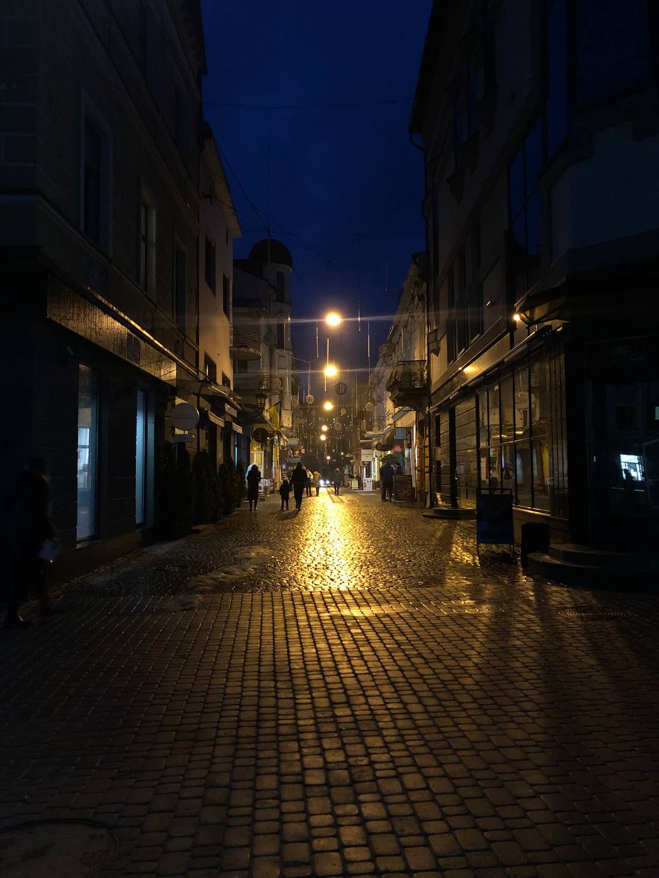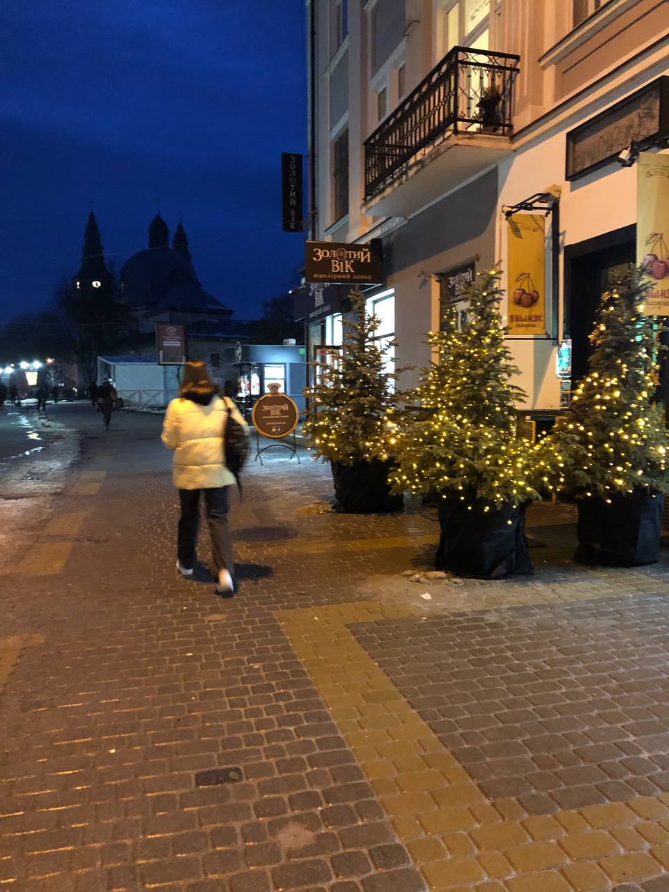 Вулиця Валова, де постійно миготіли ілюмінації цього року в повній темряві. Жодної ялинки, гірлянди чи іграшок ми не побачили.