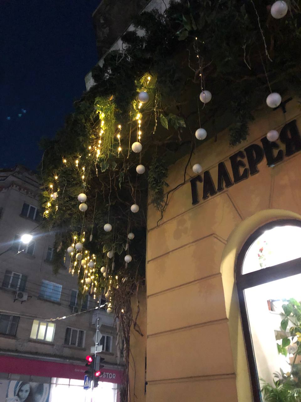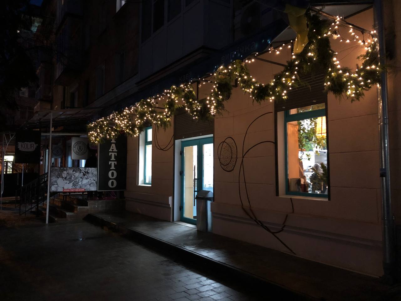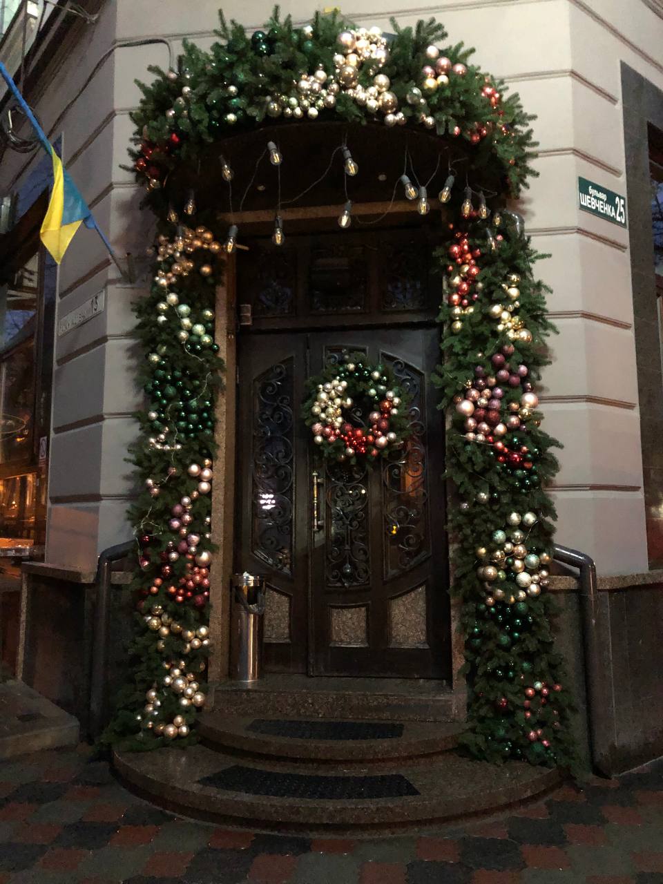 На бульварі Тараса Шевченка одразу кілька закладів вже давненько виглядають святково. Зокрема, фасад будинку №25 прикрашений натуральними ялинковими гілками. А на дверях величезний різдвяний віночок. До гілочок додали трохи зелених, червоних, золотистих іграшок і отрималася справжня краса. Також не обійшлося без масивної вуличної гірлянди.