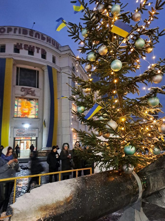 У Хмельницькому ялинка також нагадує про воєнний час та події, що ми зараз переживаємо. Новорічне дерево встановили на уламку ракети С-300, що привезли з Харківської області.