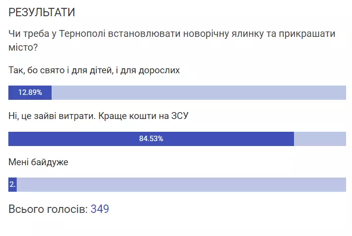 Журналісти «20 хвилин» також проводили власне опитування серед читачів. Майже 85% проголосували за те, що кошти на встановлення ялинки доречніше витратити на Збройні сили України.