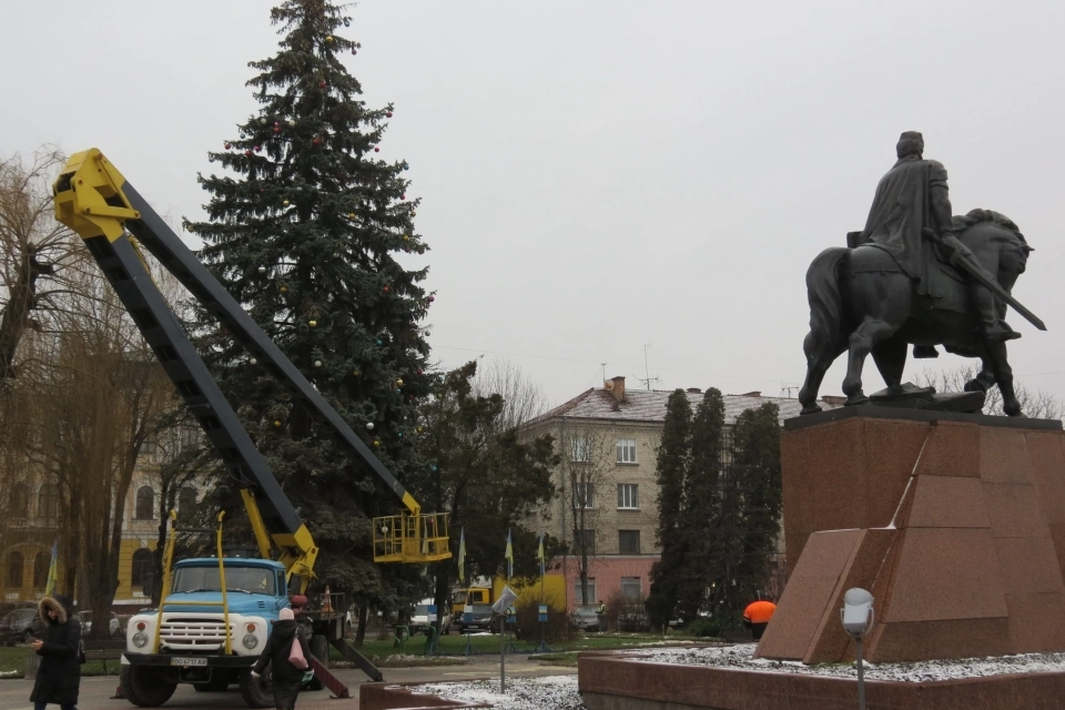 На майдані Волі біля пам'ятника Данилові Галицькому прикрасили живу ялинку кульками, а на верхівку встановили зірку.