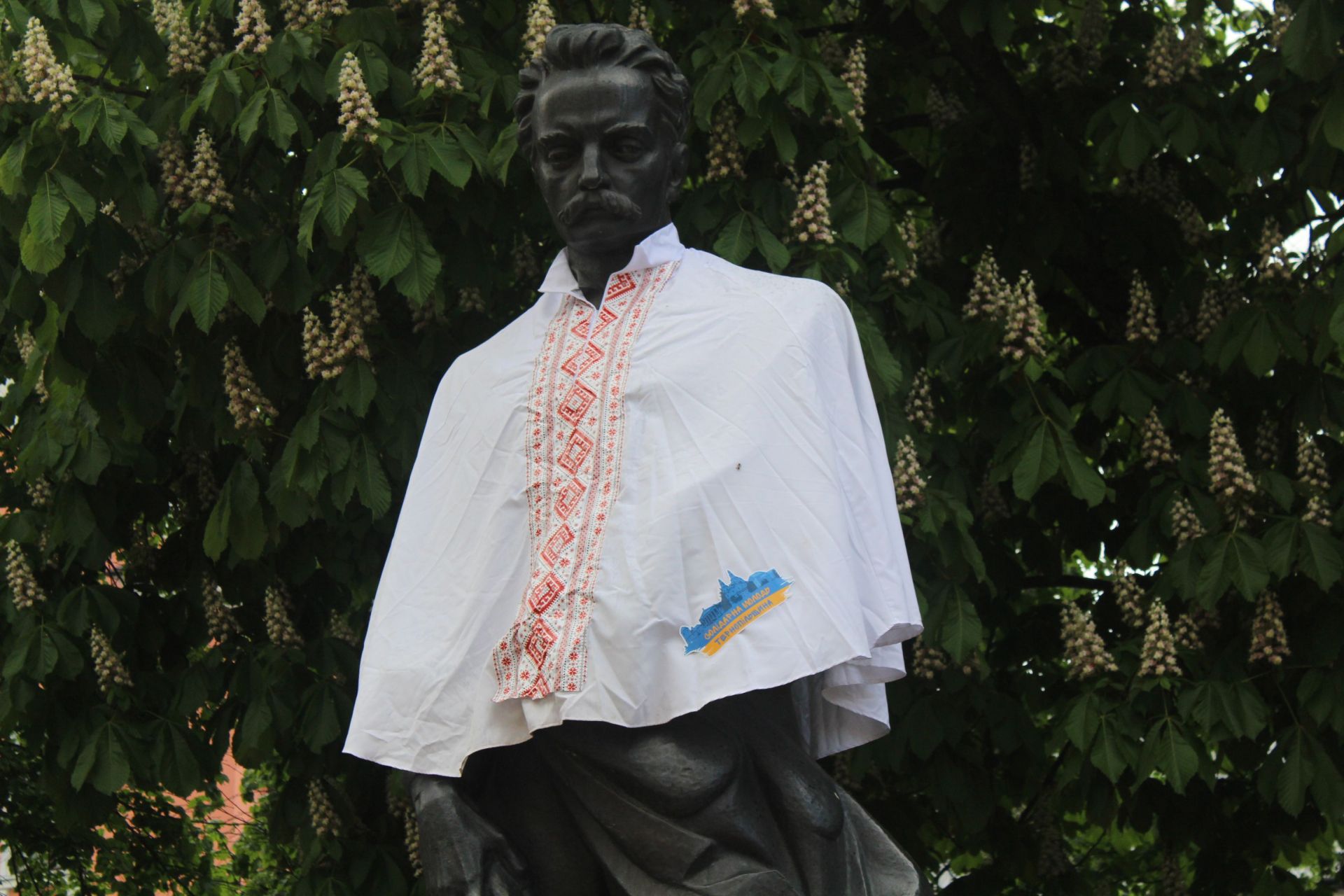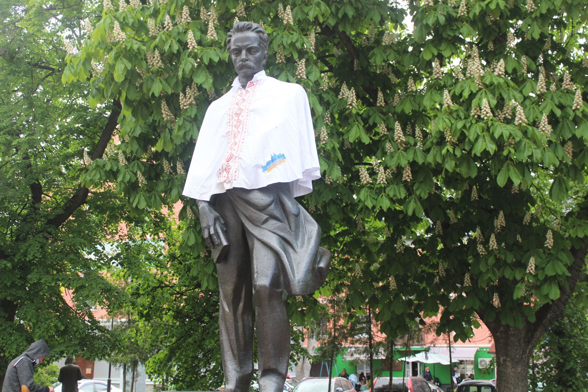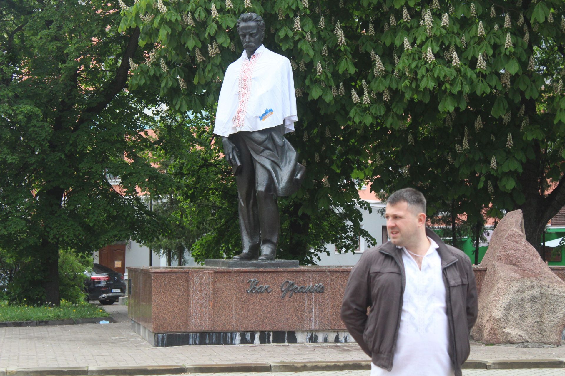 Минулого року до свята вишиванку одягнули на пам’ятник Тараса Шевченка біля драмтеатру. Цього року – у вишивці Франко. Його фотографують перехожі.