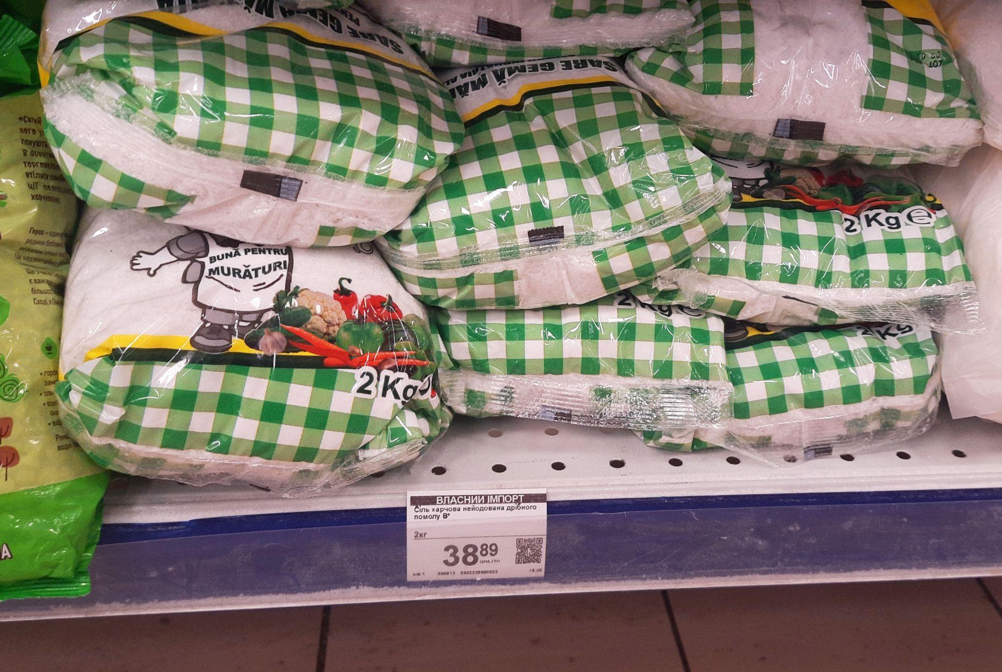 Тут було дуже склад відшукати сіль на полицях, продавці розташували пачки на найнижчих поличках. На упаковці не вказано країну виробника, втім, за штрхкодом та мовою на пачці можна вирахувати, що ця сіль привезена з Румунії. Власний імпорт, як цю сіль гордо називають в цій мережі, коштує 38.89 гривень за двохкілограмову пачку. Відповідно один кілограм румунської солі коштує 19.45 гривень.