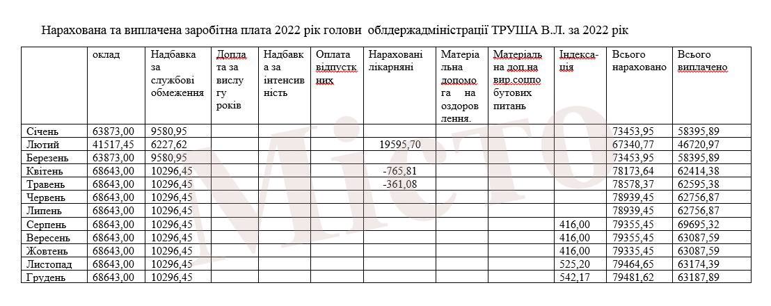Загалом за перший рік повномасштабної війни Володимиру Трушу нарахували 925 872,2 грн зарплати, а виплатили 736 269,03 грн.