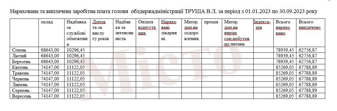 Нагадаємо, що у відповіді на інформаційний запит, який надсилали «20 хвилин», нам повідомили, що у 2022 році «голові облдержадміністрації не встановлювалася та не виплачувалася надбавка за вислугу років і за інтенсивність праці, премія і матеріальна допомога». У таблиці з доходами, яку оприлюднили на сайті «Газета Місто», немає вищезазначених даних. Та ми не можемо стверджувати, що цих виплат панові Трушу не було, адже окремих документів, які би це підтверджували, немає.