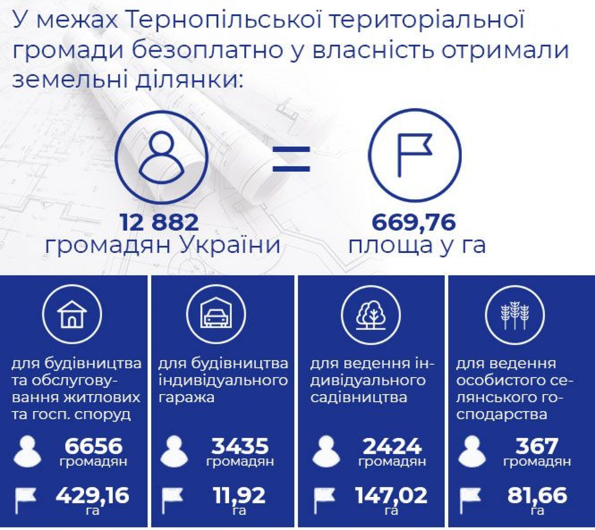 - Скільки і яку землю вже роздали на території Тернопільської громади в порядку безкоштовної приватизації? І де зараз готують такі землі? Чи є проблеми із їх отриманням?