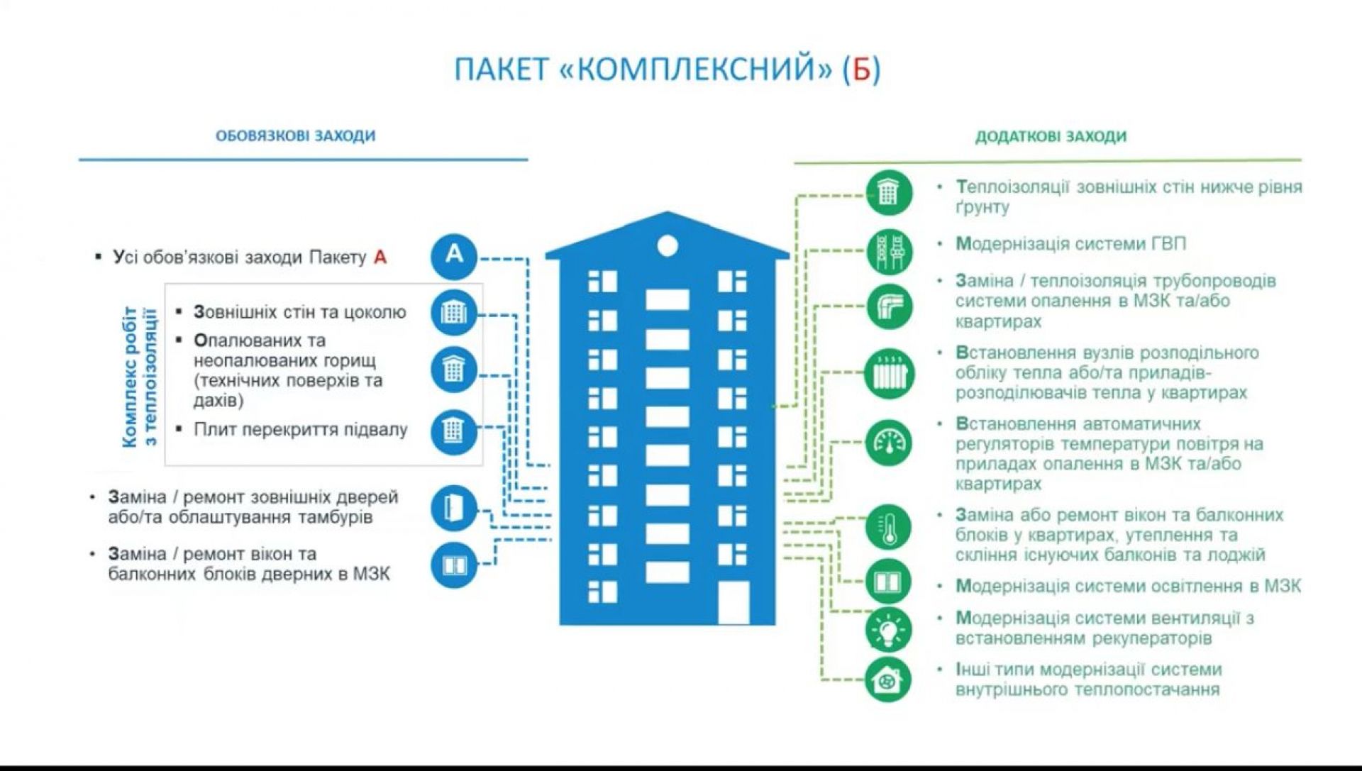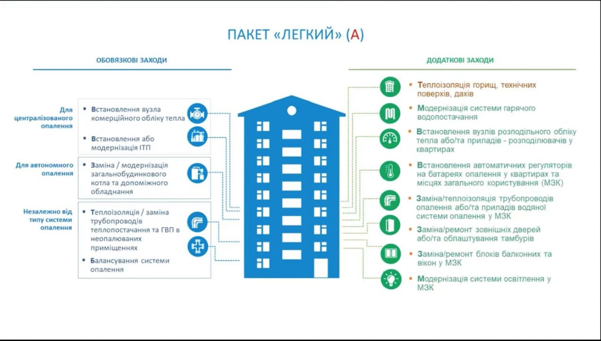 Простіше кажучи, пакет «А» вміщує в себе вимогу модернізувати систему опалення та суміжні до неї речі. Пакет «Б» є комплексним і вміщує в собі заходи пакету «А», а також максимальну кількість інших енергоефективних заходів (утеплення даху, заміна вікон і дверей тощо). Більше дивіться нижче.