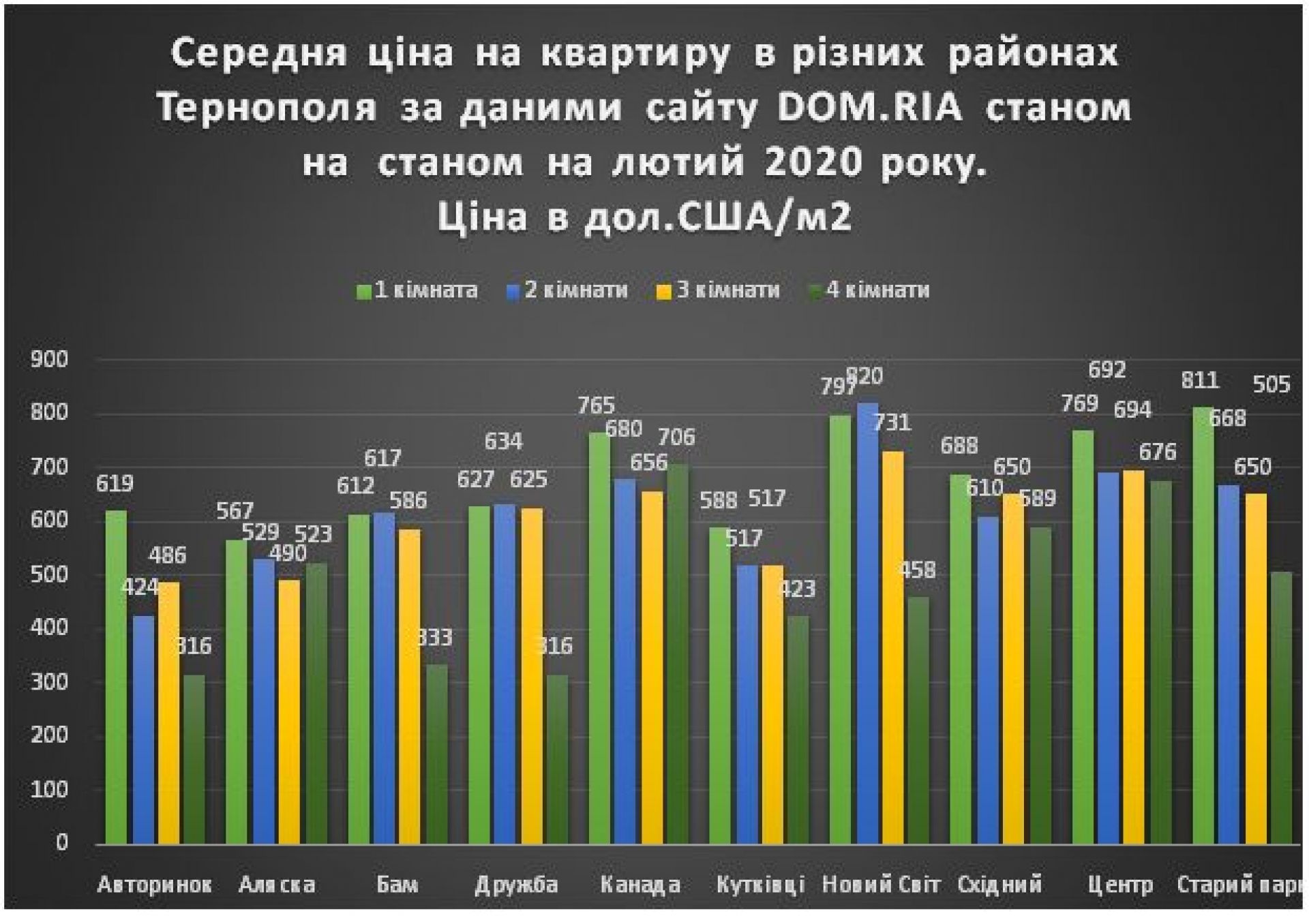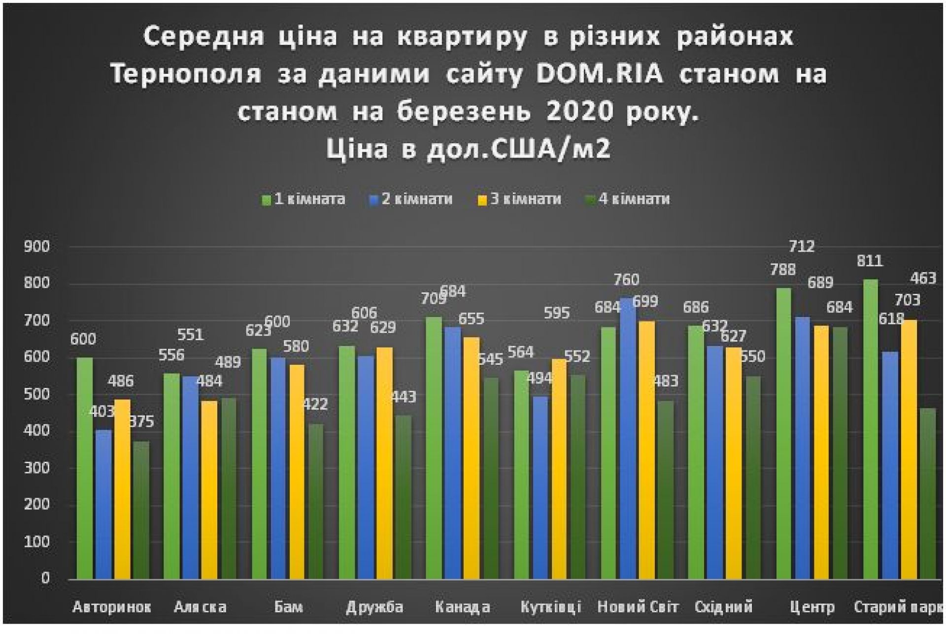 Найбільше змінилася ціна на чотирикімнатні квартири, так в районі Канади ціна на такі квартири змінилася з 706 дол.США/м2 до 545 дол./м2., а на Кутківцях - з 423 дол./м2 до 552 дол./м2. В районі ж Баму ціна за квадратний метр чотирикімнатної квартири змінилася з 333 до 422 дол.США, а на Дружбі – з 316 дол до 443 дол.