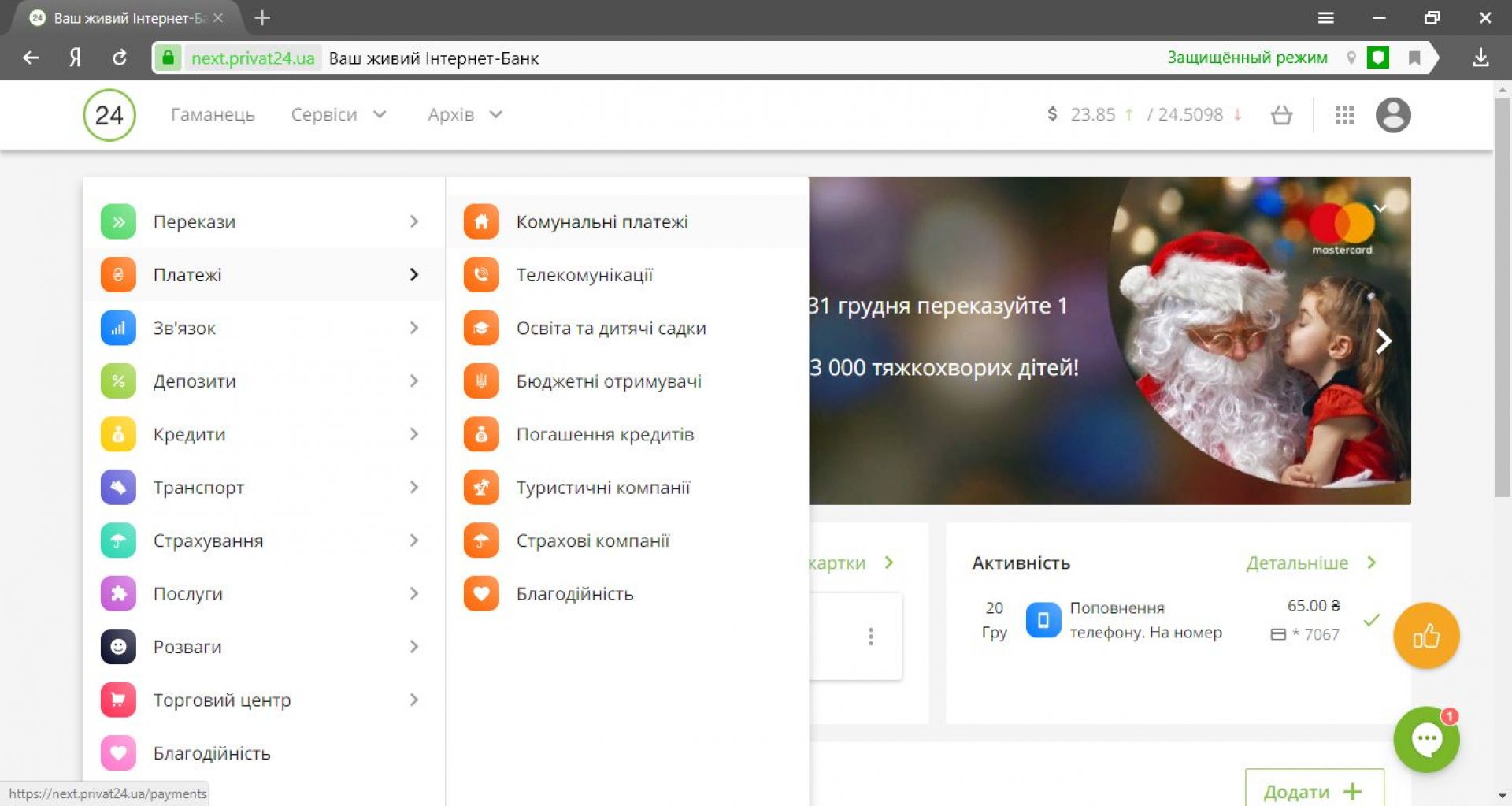 Найбільш популярний банк також надає можливість оплатити комуналку з дому, за допомогою онлайн-кабінету. Для цього вам потрібно лише мати свій обліковий запис. Якщо ви користувач «ПриватБанку», але ще не маєте особистого кабінету в «Приват24», його можна створити за кілька хвилин. У «Приват24» можна заплатити не тільки за газ, воду чи електрику, а і за телефон, інтернет, телебачення та багато інших послуг. Для сплати комунальних послуг потрібно увійти в спеціальний розділ. Проблем зі сплатою послуг виникнути не повинно, оскільки інтерфейс інтуїтивно зрозумілий. Пошукові реквізити можна знайти за рахунком, адресою чи особовим рахунком. Ви можете налаштувати регулярну сплату заборгованості. Комісія за здійснення платежів онлайн від 1 до 3 гривень.