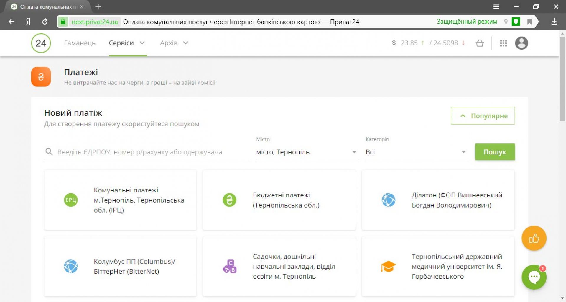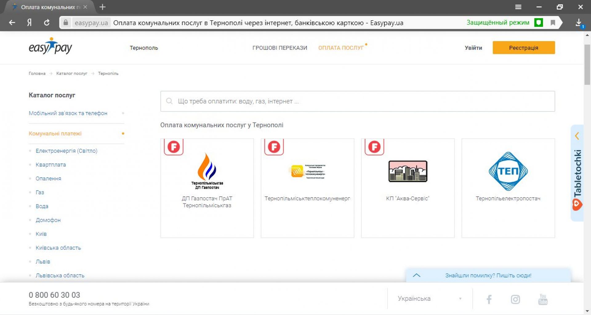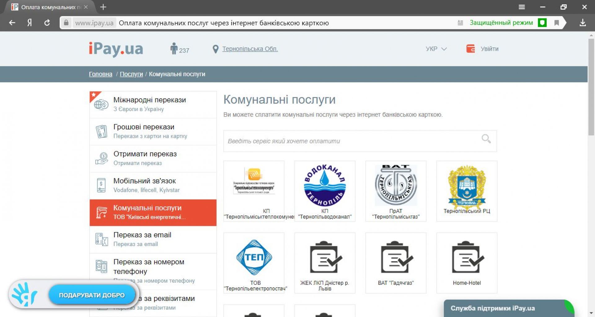Якщо ви маєте карту будь-якого банку, однак не знаєте чи не хочете проводити операцію через онлайн-банк – можна скористатися іншими платіжними ресурсами. Цей ресурс дозволяє обрати регіон. Тоді вам буде показані всі комунальні підприємства, за послуги яких ви можете оплатити вашою карткою. Для Тернополя - це КП "Тернопільміськтеплокомуненерго", КП "Тернопільводоканал", ДП "ГАЗПОСТАЧ" ПАТ "Тернопільміськгаз", Тернопільський РЦ, ТОВ "Тернопільелектропостач" та деякі інші. Перевага даного ресурсу в простоті – не потрібно ніде реєструватися, створювати електронний кабінет, тощо. Однак комісія за послуги вища, ніж в онлайн-банках. Обравши регіон, ви заходите на потрібне підприємство і далі вводите номер вашого рахунку, суму, яку хочете оплатити, а далі – реквізити вашої картки. Якщо зареєструватися на даному сервісі – то виз можете зберігати шаблони платежів та проводити їх регулярно.