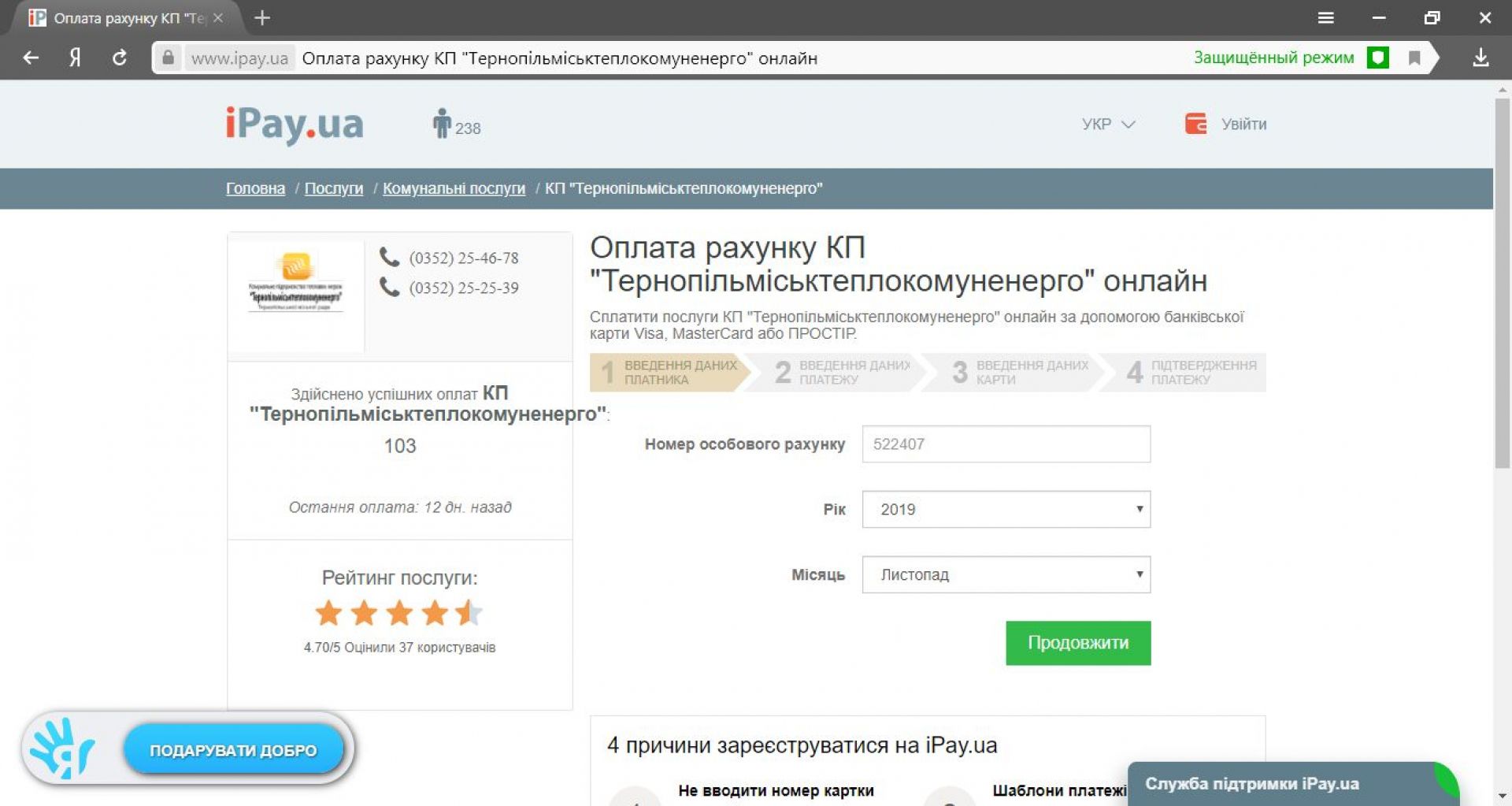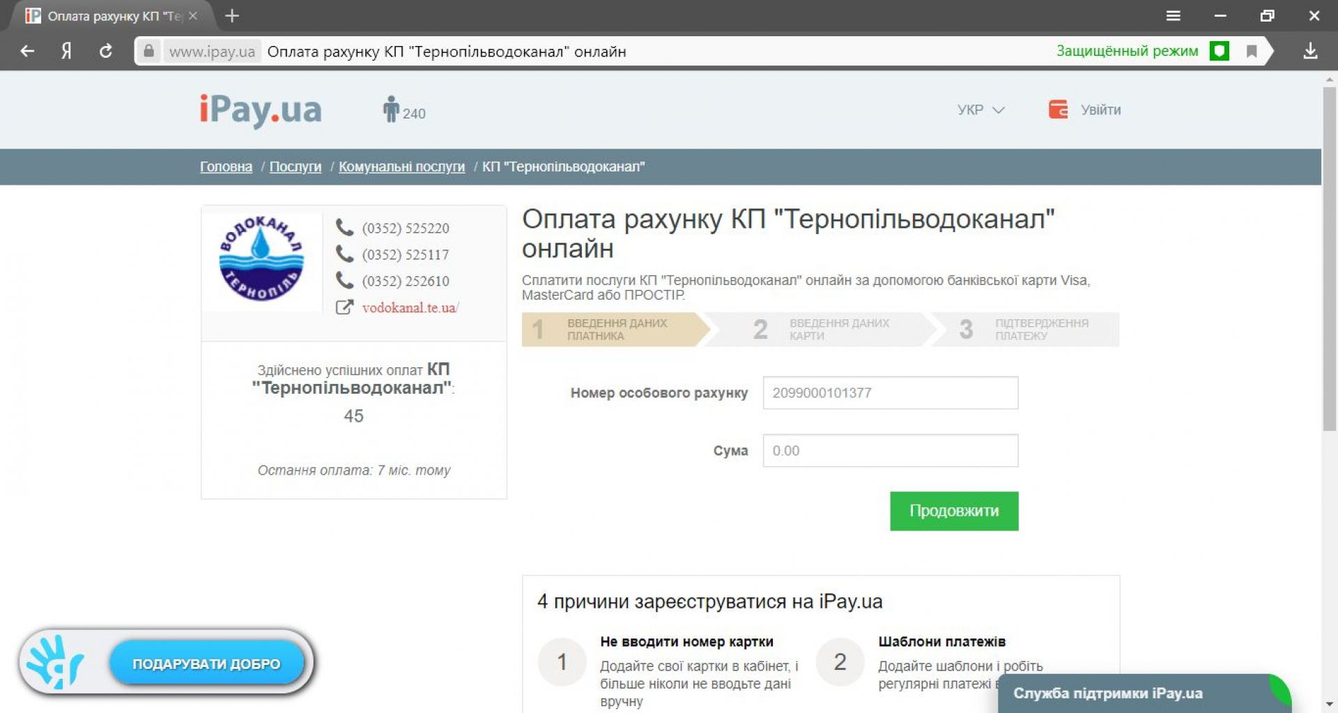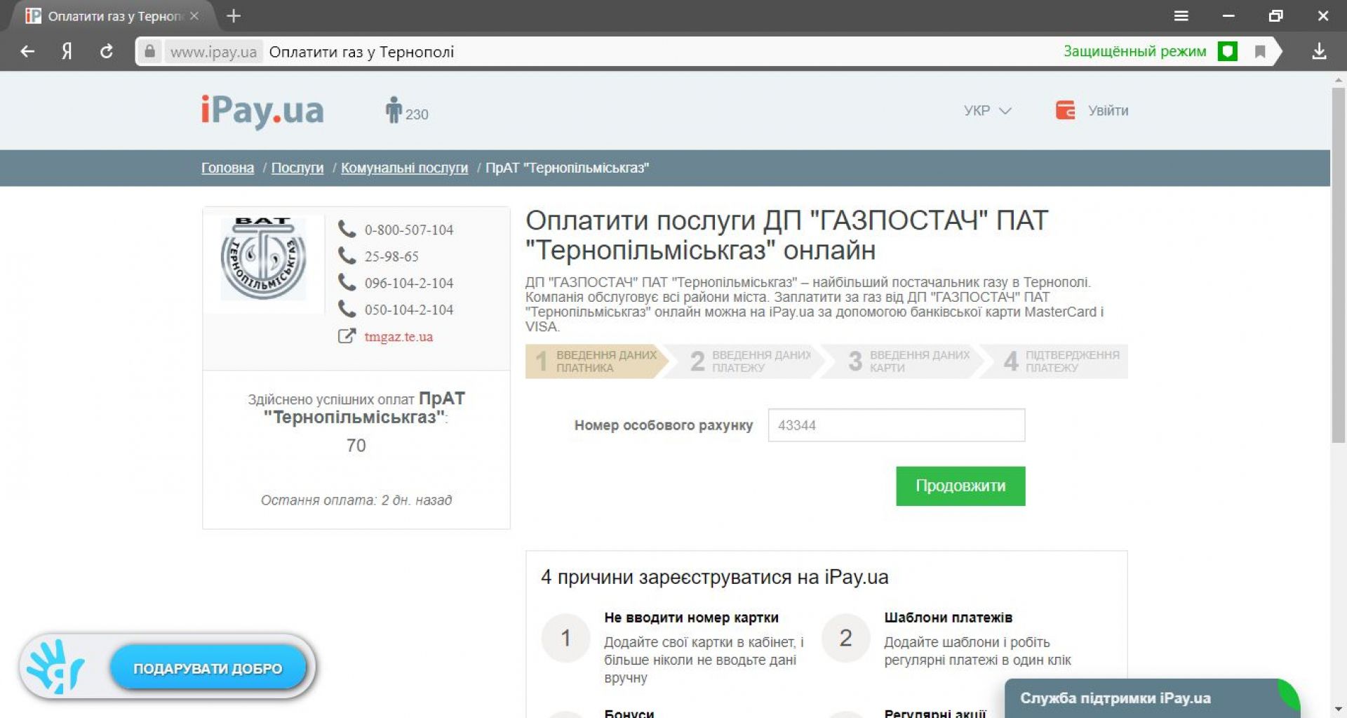 Якщо ви маєте карту будь-якого банку, однак не знаєте чи не хочете проводити операцію через онлайн-банк – можна скористатися іншими платіжними ресурсами. Цей ресурс дозволяє обрати регіон. Тоді вам буде показані всі комунальні підприємства, за послуги яких ви можете оплатити вашою карткою. Для Тернополя - це КП "Тернопільміськтеплокомуненерго", КП "Тернопільводоканал", ДП "ГАЗПОСТАЧ" ПАТ "Тернопільміськгаз", Тернопільський РЦ, ТОВ "Тернопільелектропостач" та деякі інші. Перевага даного ресурсу в простоті – не потрібно ніде реєструватися, створювати електронний кабінет, тощо. Однак комісія за послуги вища, ніж в онлайн-банках. Обравши регіон, ви заходите на потрібне підприємство і далі вводите номер вашого рахунку, суму, яку хочете оплатити, а далі – реквізити вашої картки. Якщо зареєструватися на даному сервісі – то виз можете зберігати шаблони платежів та проводити їх регулярно.
