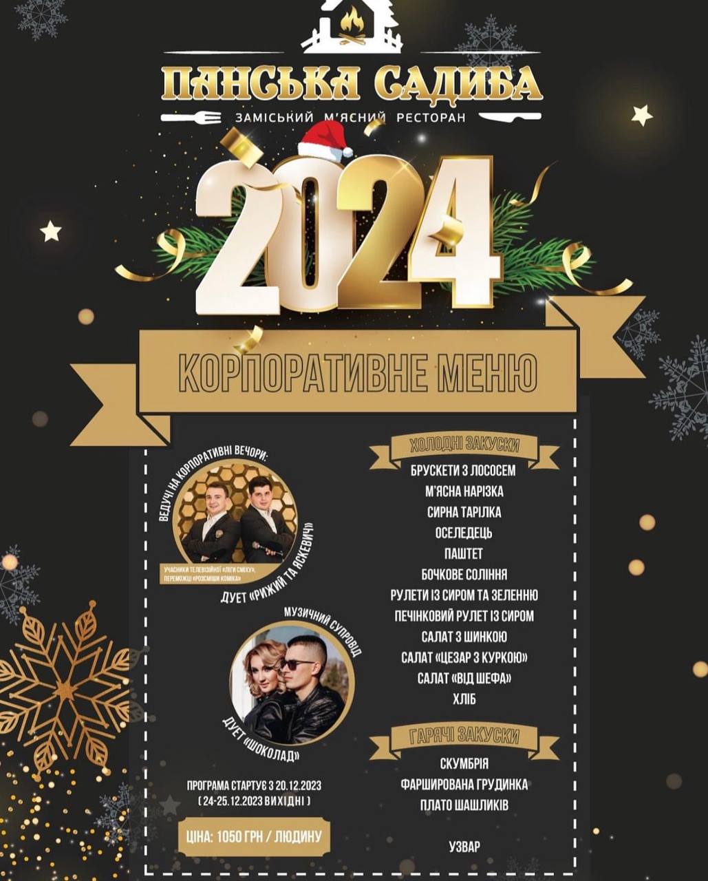 — Ви зможете скуштувати брускети з куркою, італійське м’ясне плато, закуску з оселедця, сет фірмових намазок. Є в меню два салати: делікатесний та з норвезького лосося. А також гарячі страви: підкопчений стейк з яловичого язика від шефа, куряча грудинка, овочі гриль, фірмова страва каре свинини з м’ясним соусом, картопля з пармезаном. Алкогольні та безалкогольні напої кожен колектив приносить із собою, — додають в ресторані.