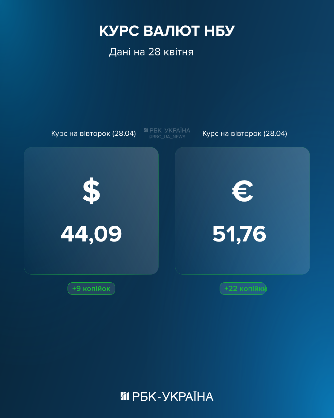 На 28 квітня НБУ встановив офіційний курс долара на рівні 44,09 грн, що на 9 копійок вище за курс 27 квітня (44,00 грн).