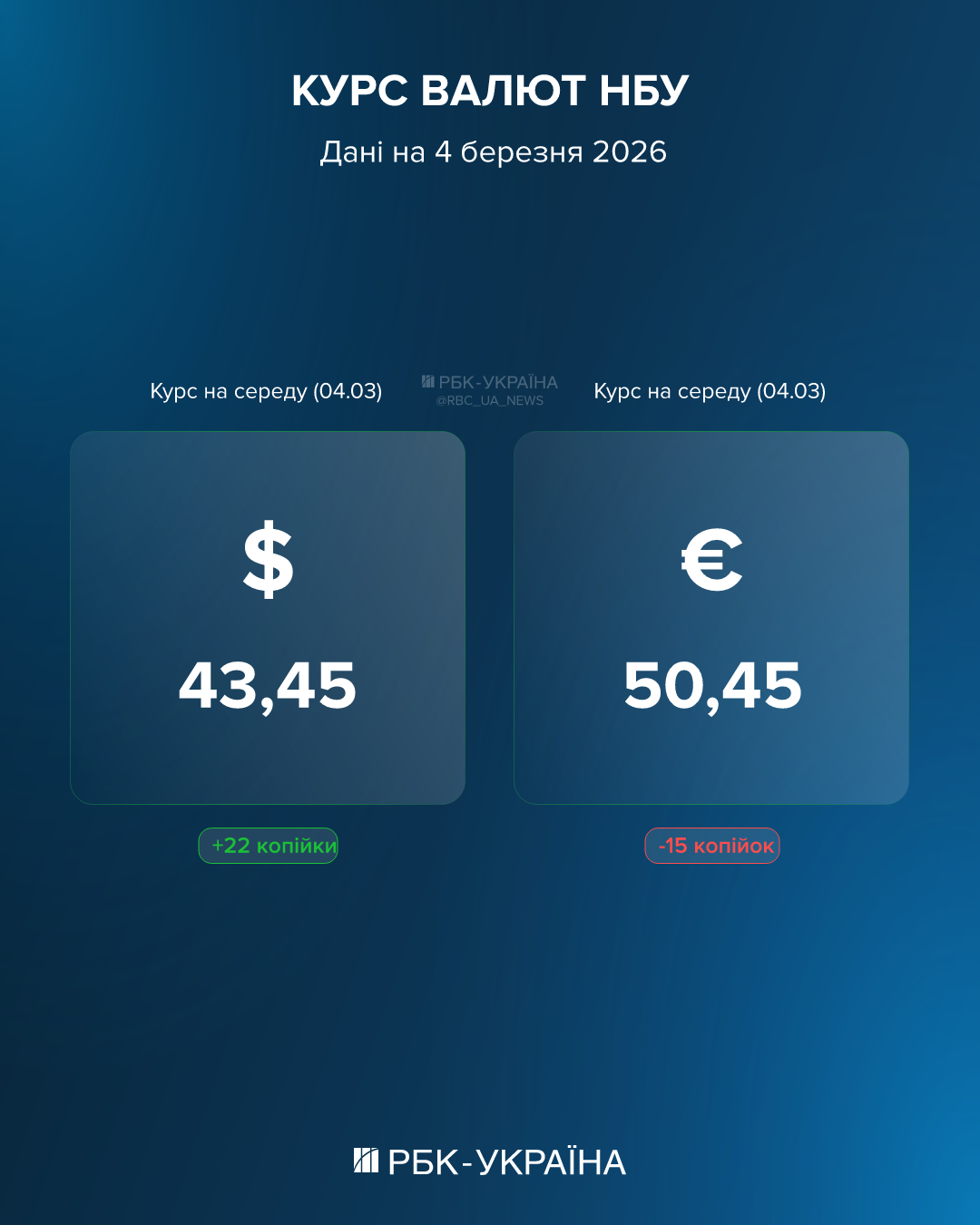 Національний банк України встановив на середу, 4 березня, офіційний курс долара до гривні на рівні 43,45 гривні за долар. Курс гривні до євро встановлено на рівні 50,46 грн/євро.