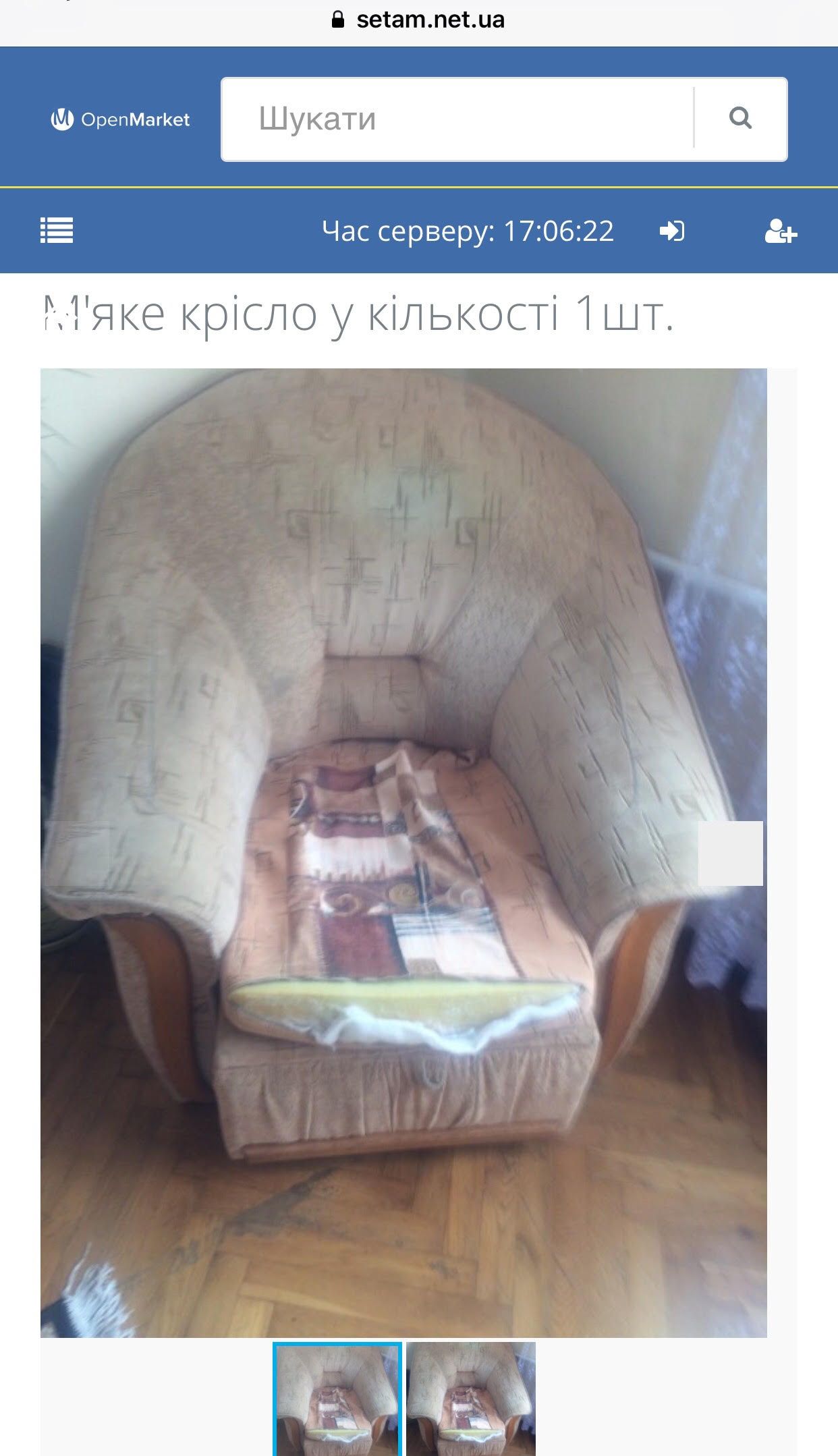 Розділ «Меблі» у «Товарах для дому» на СЕТАМі багатий різним. Тут можна знайти шафи, стінки, дивани, і крісла. Наприклад, судячи з фото, це крісло, що у Козові, вже розвалюється, але його все ж надіються продати за 425 грн, а то й вище! Аукціон на нього проведуть 26 серпня. Крок аукціону – 21 грн. 25 коп.
