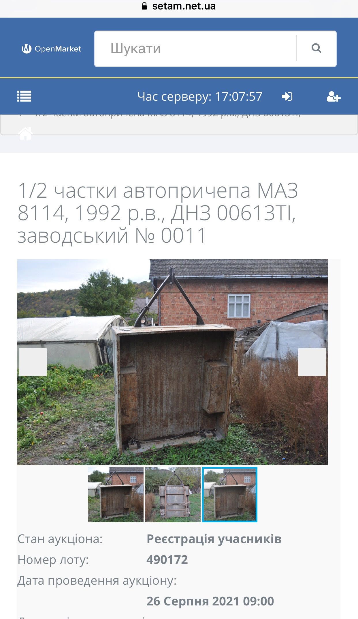 Кому шматочок автопричепа з Касперівець? У СЕТАМі продають 1/2 частки автопричепа МАЗ 8114, 1992 року випуску. Стартова ціна – 2 190 грн. Крок аукціону – 109 грн. 50 коп. Планують провести аукціон 26 серпня. Цікаво, що у харектеристиці лоту не приховують: кузов вражений іржею по всьому периметру, пошкоджено лакофарбове покриття.