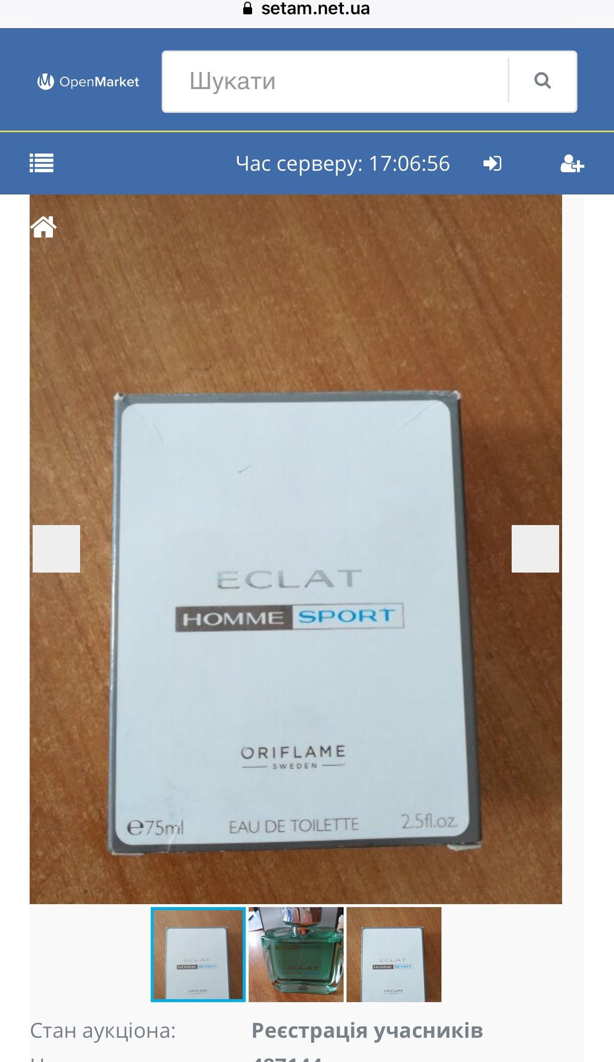 Духи чоловічі фірми виробника Oriflame Home sport об’ємом 75 мл також пропонують на аукціоні. По фото видно, пачка не нова. Можливо, 75 мл там вже немає? Стартова ціна духів – 250 грн, а мінімальний крок аукціону – 12 грн. 50 коп. Місцезнаходження духів – м.Борщів. Проведуть аукціон 30 серпня.