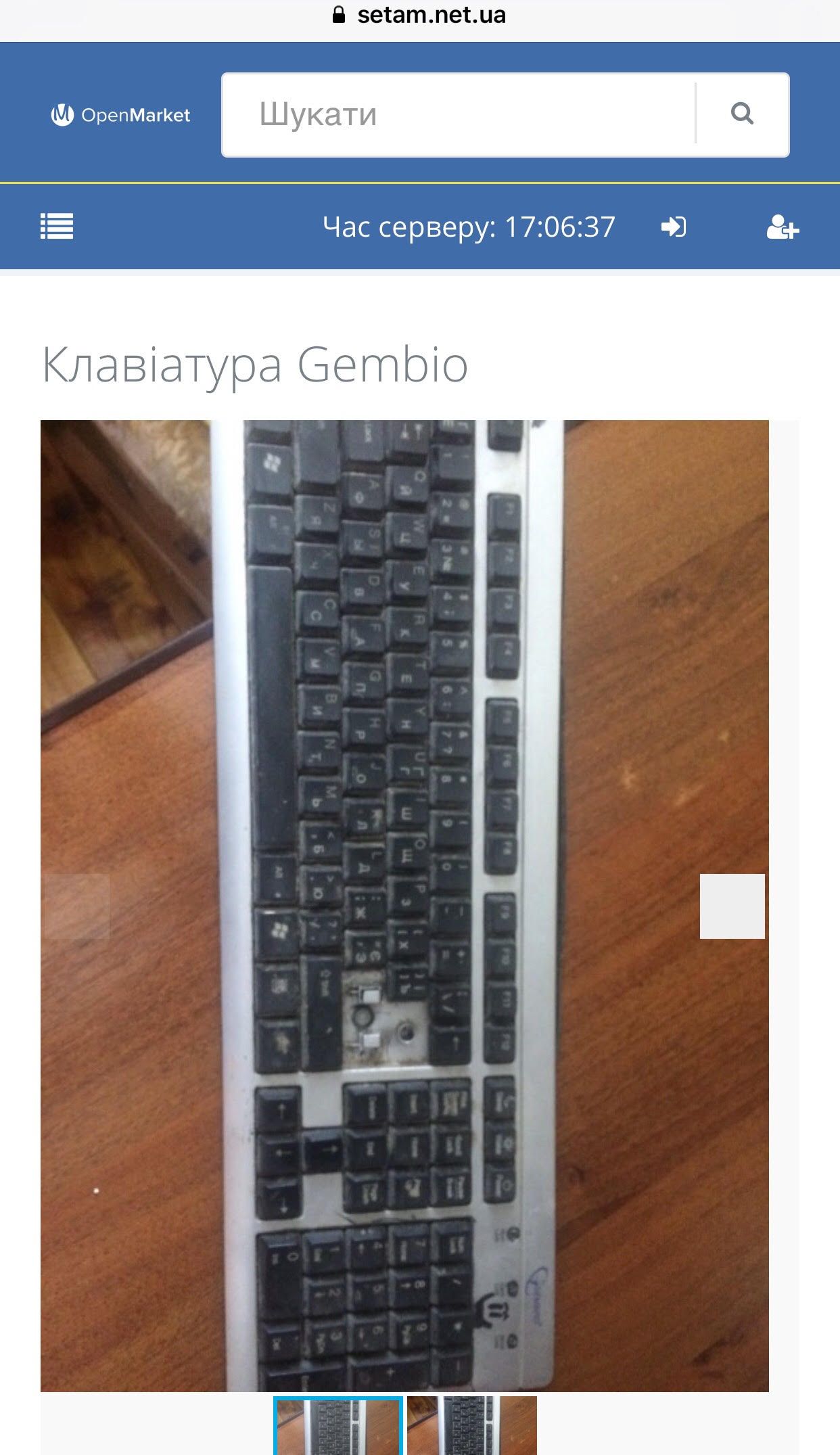 У «Електроніці» СЕТАМу пропонують клавіатуру Gembio. На фото видно пробіли на поверхні клавіатури, де клавіш немає. Тим не менше, клавіатуру теж, до речі, з Козови планують продати щонайменше за 150 грн. Крок аукціону – 7 грн.50 коп. Торги закінчаться 26 серпня.