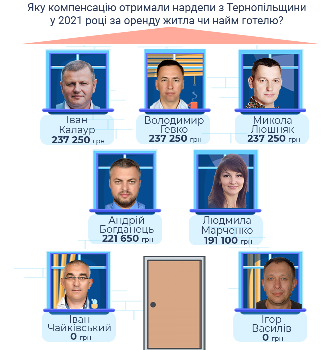 Згідно з даними апарату Верховної ради, із 1 листопада — 31 грудня 2021 року за оренду житла нардепи з Тернопільщини: Андрій Богданець, Володимир Гевко, Іван Калаур та Микола Люшняк отримали однакову суму компенсації кожен — по 39 650 грн. Загалом їхнє проживання в Києві за два місяці Держбюджету обійшлося у 158 600 грн. За місяць на кожного нашого депутата вийшло по 19 825 грн. Сума, погодьтеся, чимала.