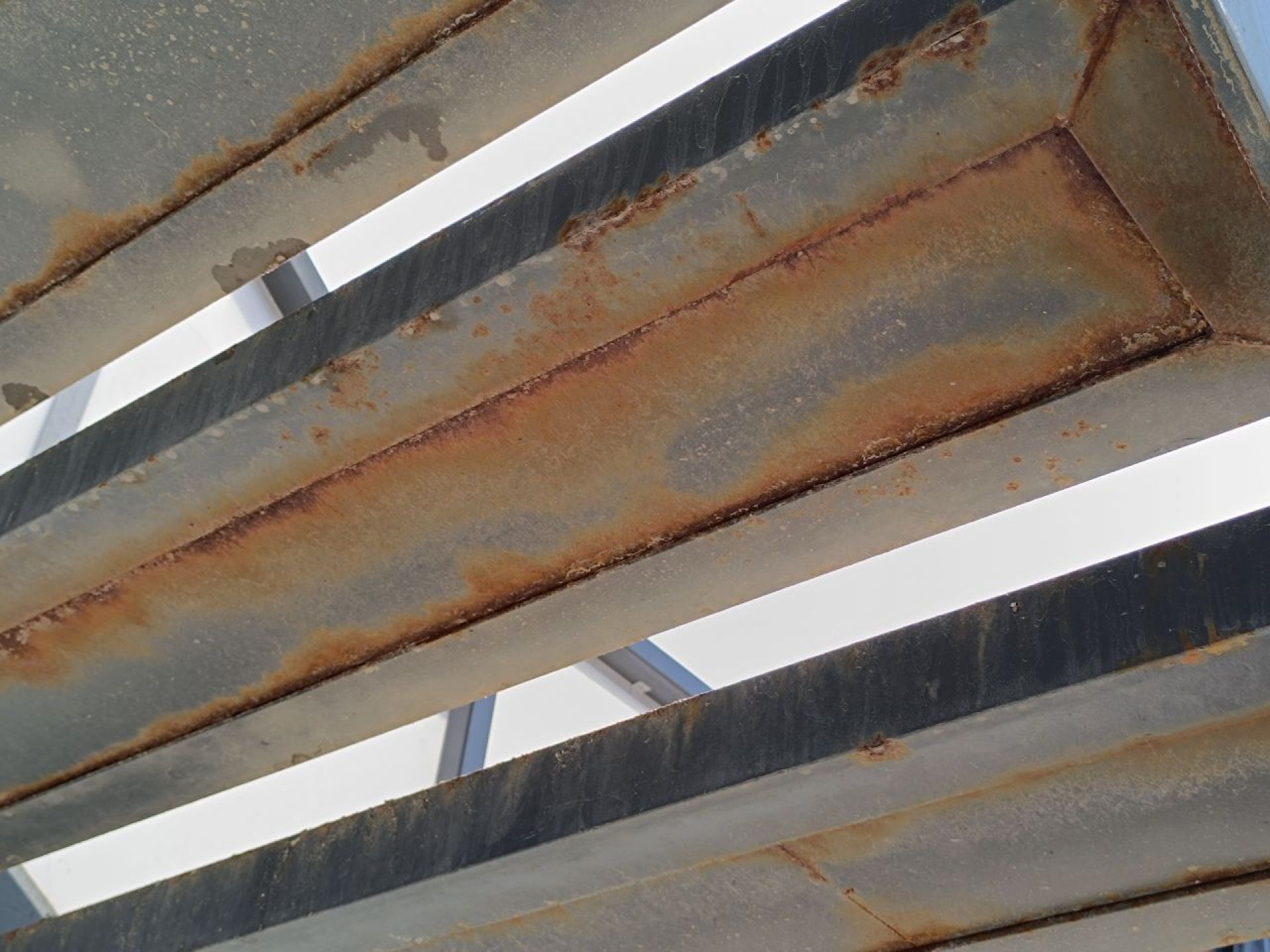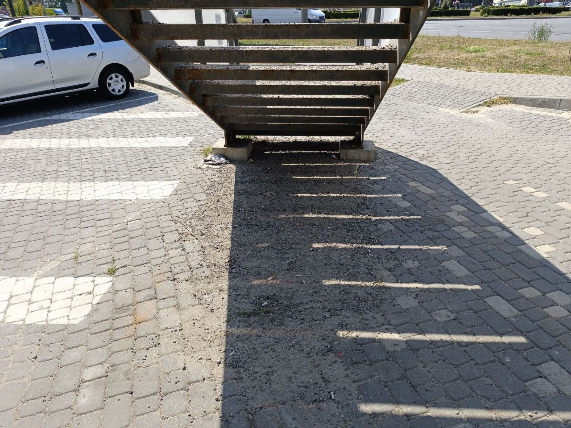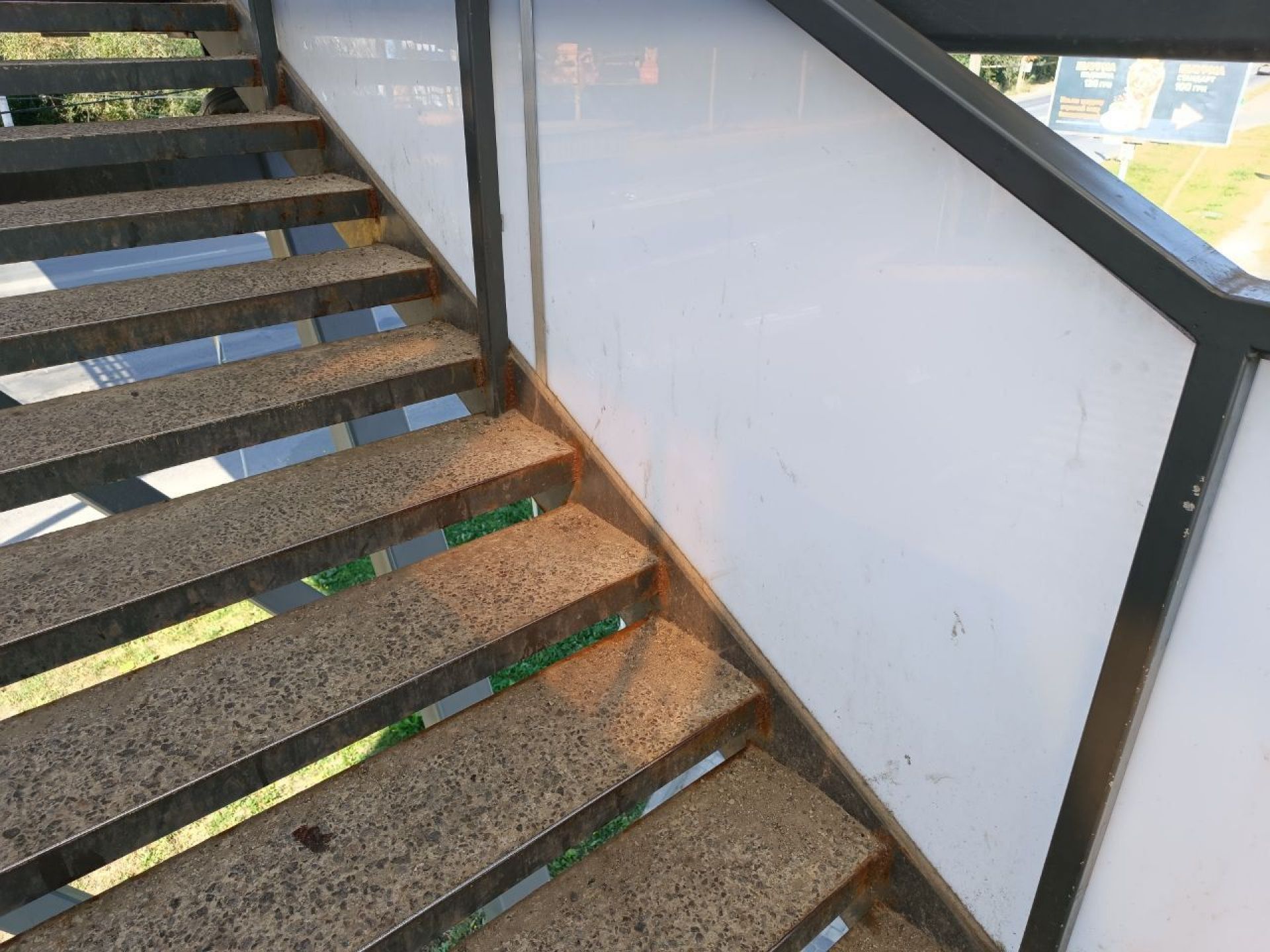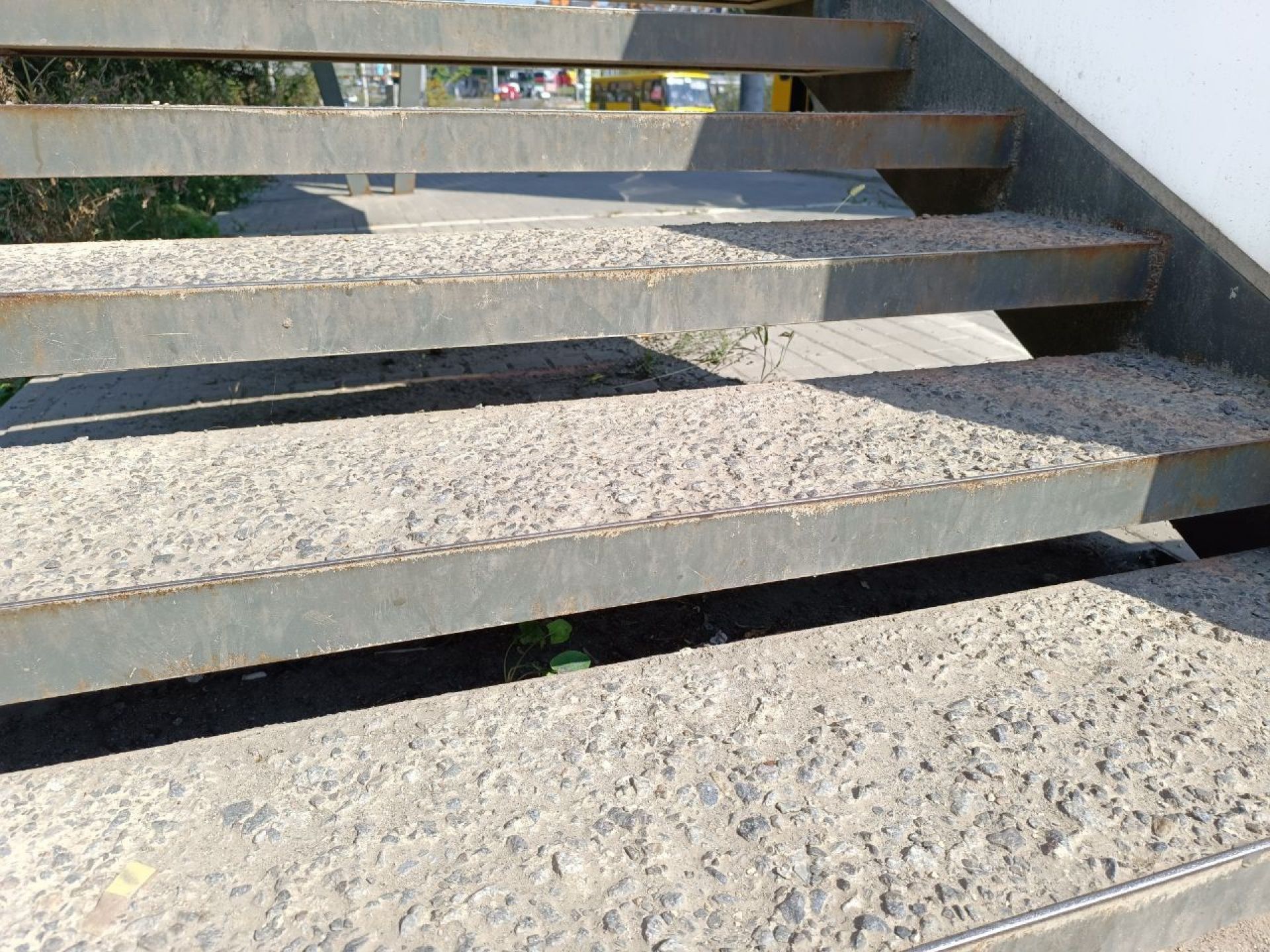 Окрім того, можна помітити, що металеві елементи конструкції іржавіють. Особливо добре це видно, якщо зазирнути під сходи. Також можна побачити брудне пластикове загородження, подекуди є графіті, але небагато.