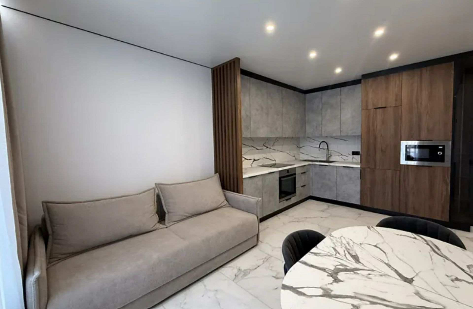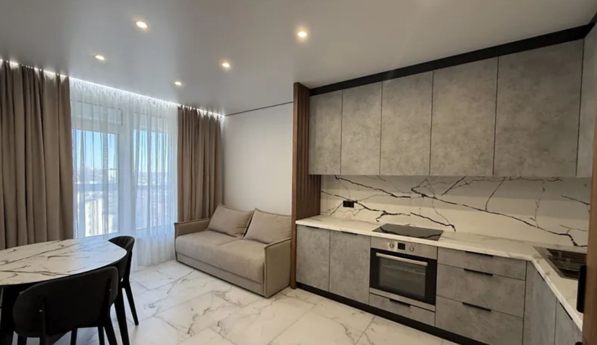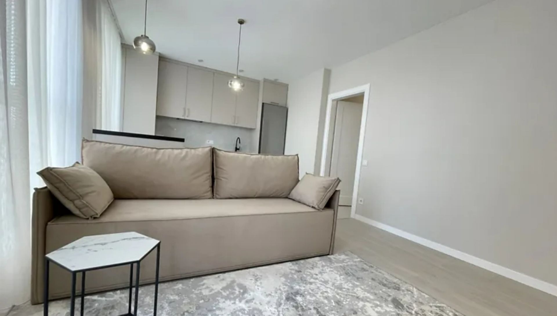 28 698 гривень за місяць проживання просять за квартиру в центральній частині міста. Загальна площа – 60 м², розташована на третьому поверсі новобудови. В оселі є базовий набір меблів: ліжко, шафи, диван, стіл, стільці та повністю укомплектована кухня. Оселя також забезпечена побутовою технікою. Є новий сучасний ремонт. Яке опалення – не вказано.