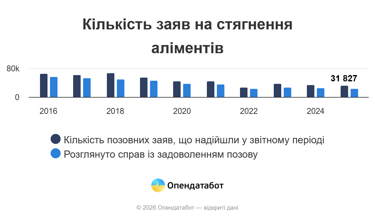 Понад 33 тисячі заяв на стягнення аліментів перебувало в українських судах у 2025 році за даними Державної судової адміністрації. 88% заяв було розглянуто, а у 86% випадках позови були задоволені. Загалом 60 млн грн аліментів присуджено стягнути торік — в середньому, 2,5 тисячі грн на справу. Водночас понад 208 тисяч проваджень за заборгованістю зі сплати аліментів нараховувалось в Україні на кінець 2025 року.
