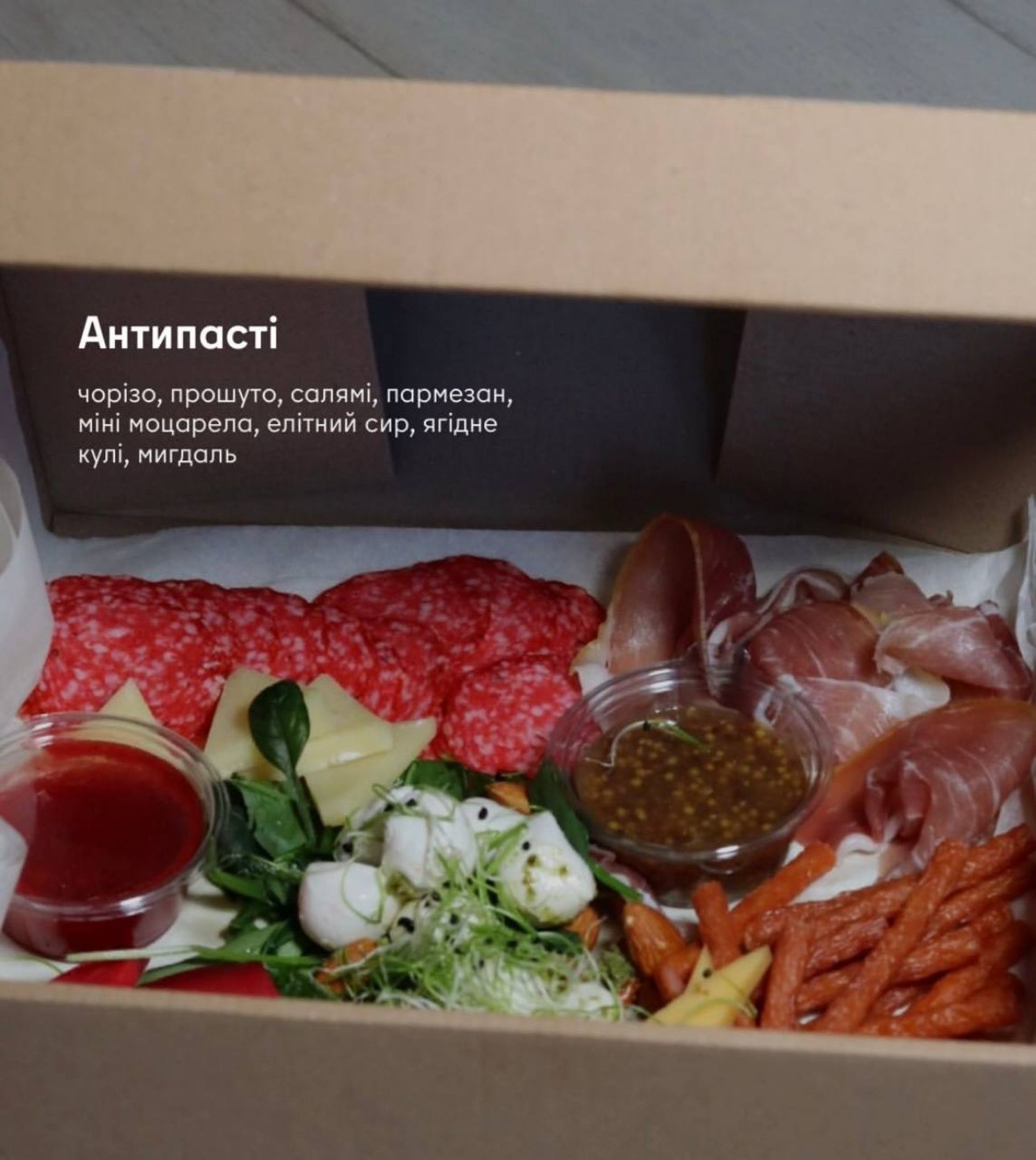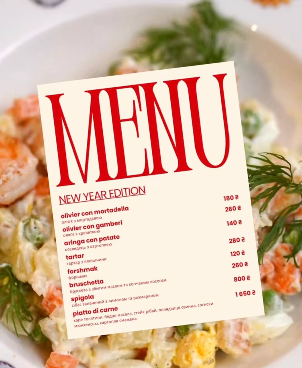 У закладі пропонують новорічне меню додому загальною вагою понад чотири кілограми, розраховане на чотирьох осіб. До нього входять холодні та гарячі страви. Серед холодних – антипасті, рибне плато, заливний яловичий язик. Також три види салатів: з тунцем гриль, з печеними овочами та олів’є. Пропонують і три види брускет – з грибами, ростбіфом, а також з оселедцем і бурячком.