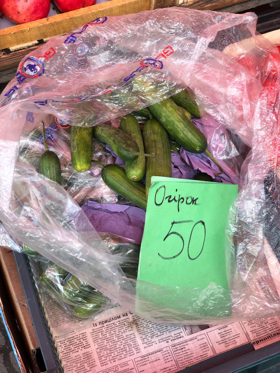 Попри те, що сезон огірків вже завершився, їх все ще можна побачити на ринку. Але вигляд їх м'яко кажучи непривабливий. Та продавчиню це не дивує і вона просить за кілограм 50 гривень.