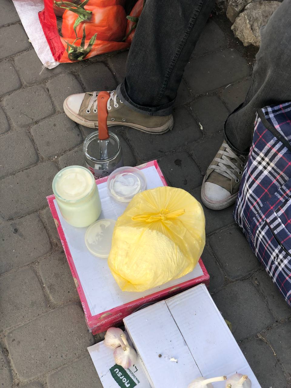 М’яса на стихійному ринку не було, лише трохи молочної продукції. За кілограм домашнього сиру просять 50 гривень, а за 0,5 літрову баночку вершків – 40 гривень. Але можна домовитися і на меншу суму. Головне – щоб на смак вам сподобався.