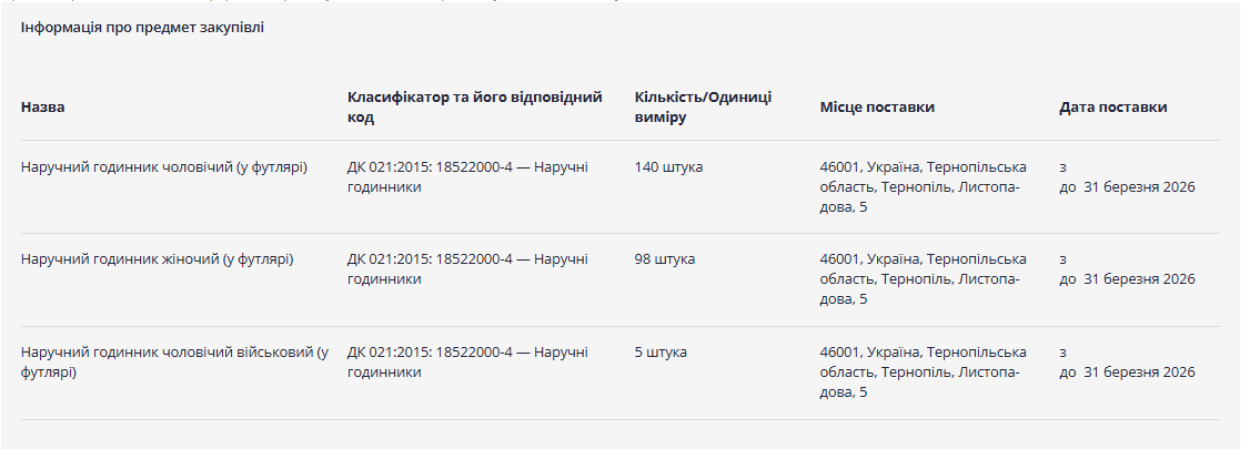 На наручний годинник (у футлярі) Тернопільська міська рада готова витратити 500 тисяч гривень. Відповідний тендер розмістили на Прозорро 27 січня.