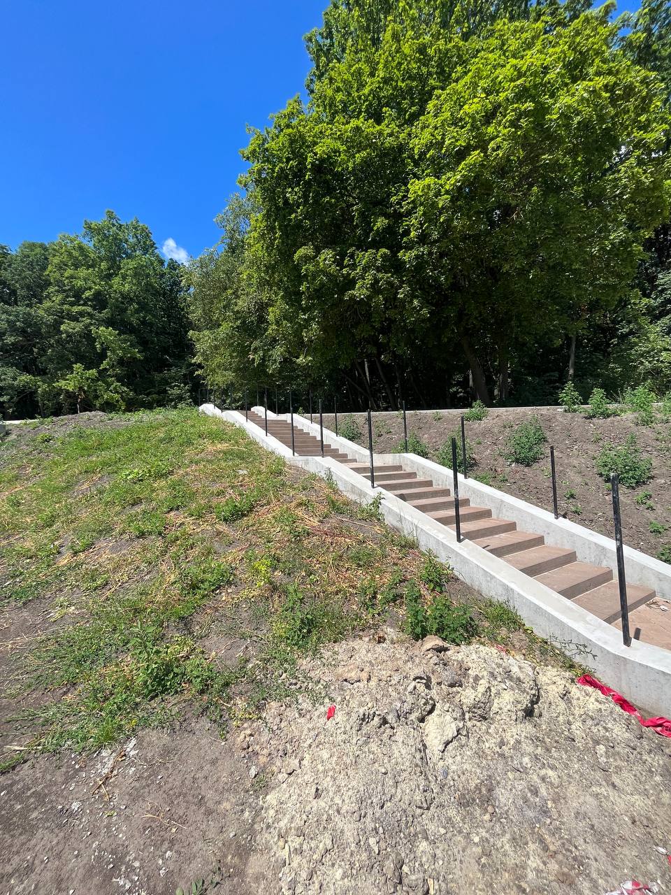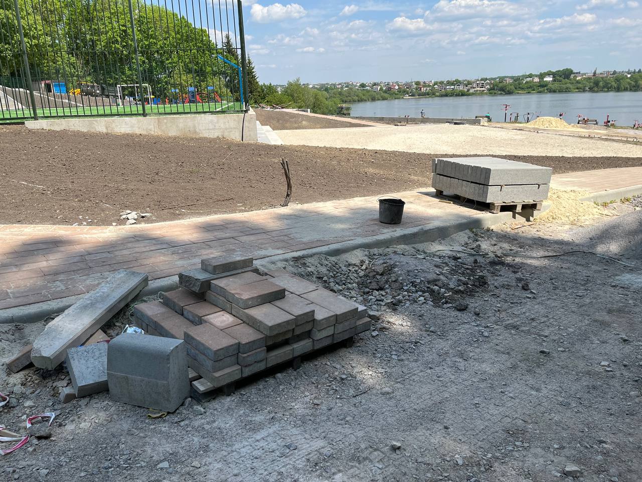 Мультиспортивне поле та дитячий майданчик розташовані поряд. Аби перейти від одного об’єкта до іншого, варто піднятися сходами, які вже зробили. Під мутиспортивним полем та майданчиком територію вимощували бетонними блоками, аби поверхня була рівною.
