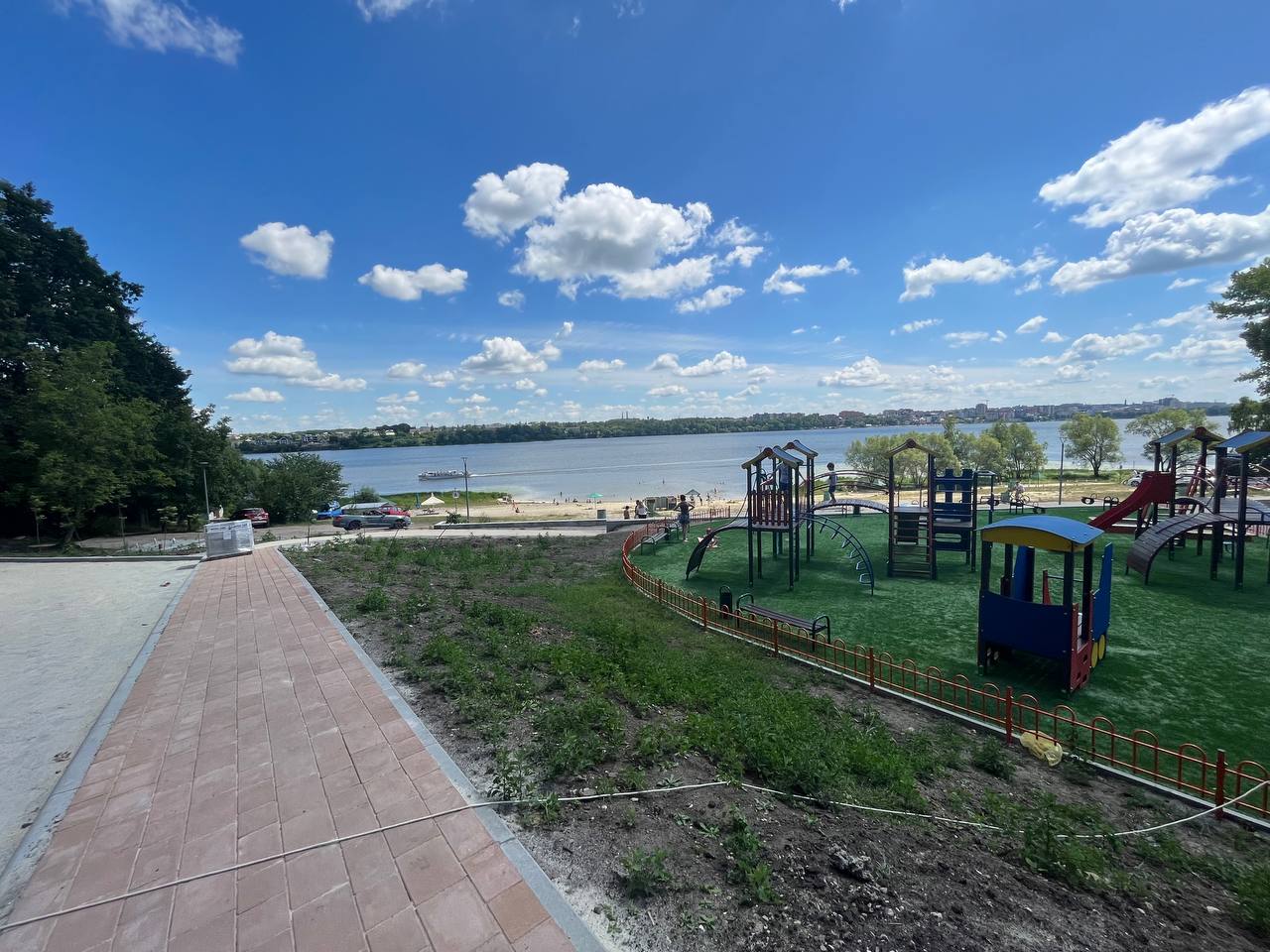 На момент нашого перебування жодних робіт щодо облаштування пляжної зони ще не проводили. Зараз там піщана територія, вкрита травою. А ось для волейбольного поля вже виділили місце – поряд з мультиспортивним.