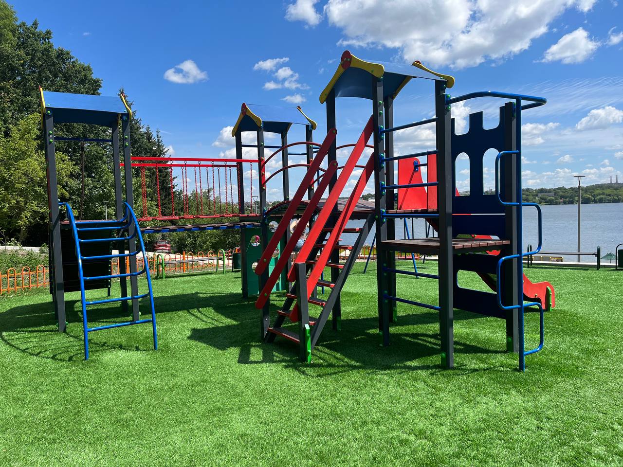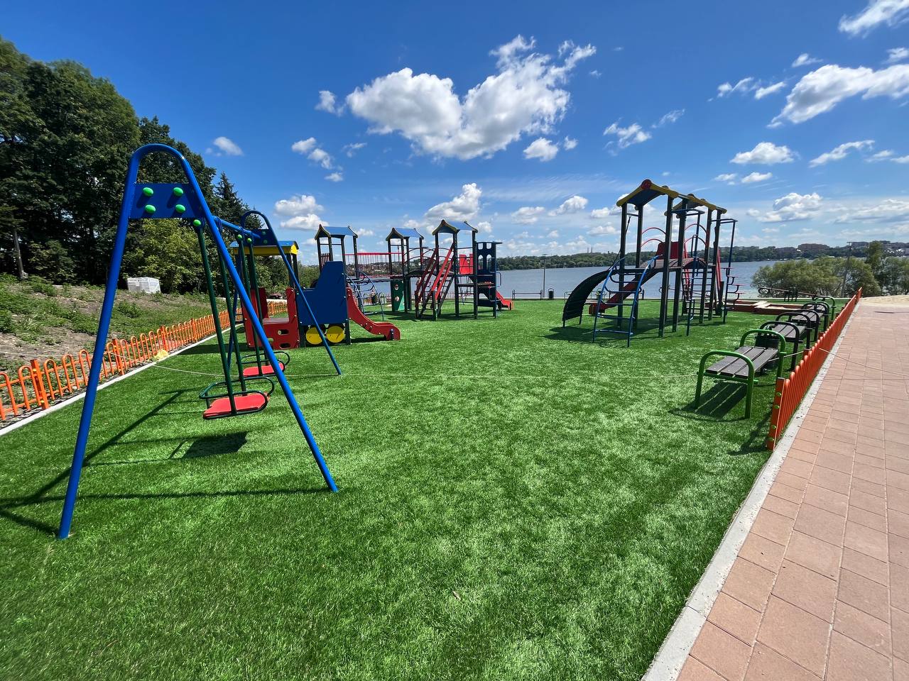 Облаштовують тут і дитячий майданчик. Є гойдалки, різні гірки, лавочки для сидіння та сміттєві баки. Територія вкрита штучною травою. Попри незавершений ремонт навколо, діти вже бавляться на гойдалках.
