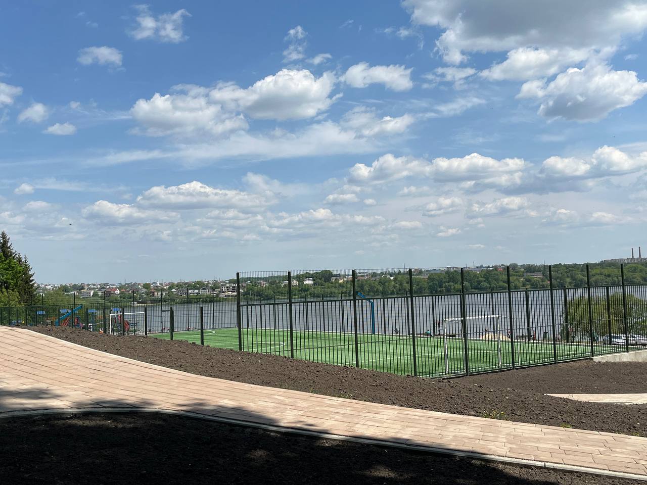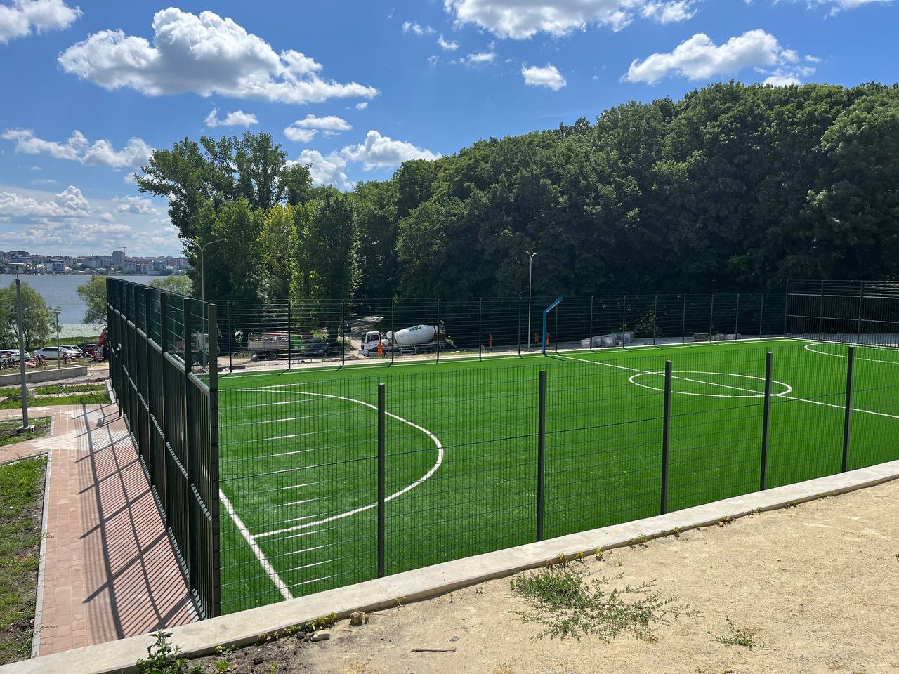 Трохи далі видніється мультиспортивний майданчик. Він зі штучним покриттям та огорожею. На території вже встановили футбольні ворота.