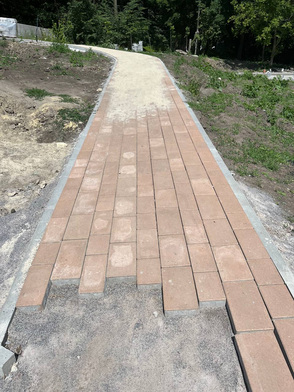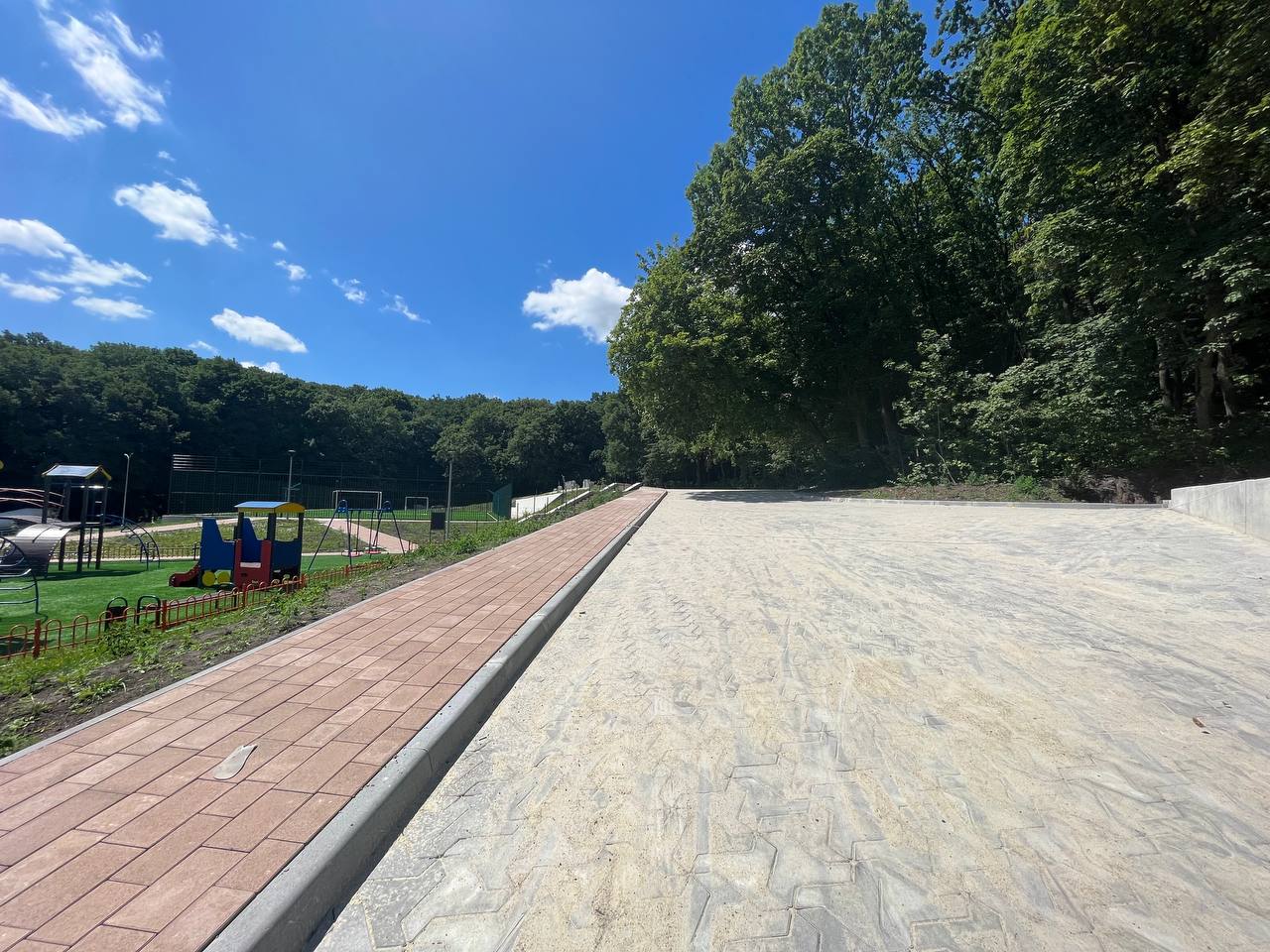 Неподалік від поля та майданчика облаштовують автомобільну стоянку. Спецтехнікою частково підготували дорогу для машин та встановили масивні тротуари з бетонних блоків. Пішохідні доріжки вимощують тротуарною плиткою. Також уже є ліхтарі.