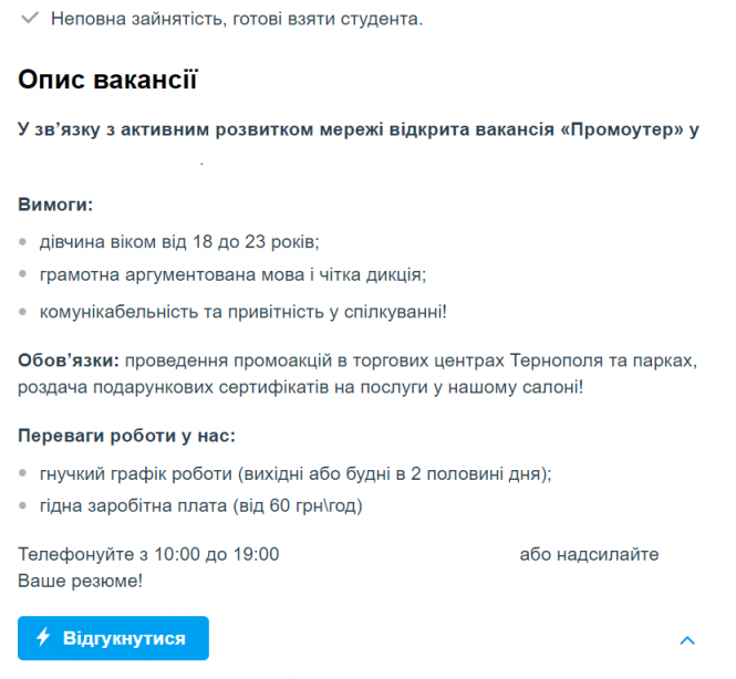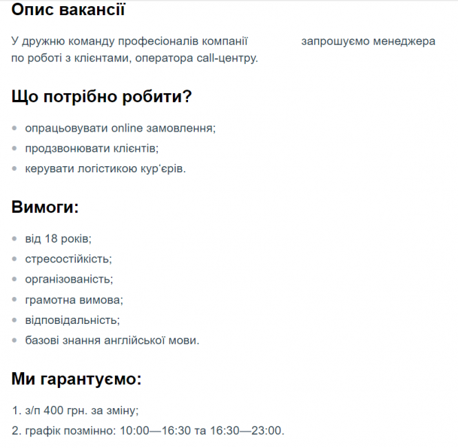 Ми зателефонували на декілька номерів у оголошеннях. Попередньої інформації небагато, адже нам пояснили, що все про роботу вже вказали у оголошенні. Нас запросили на попередню співбесіду, де ми і змогли б почути про деталі роботи.