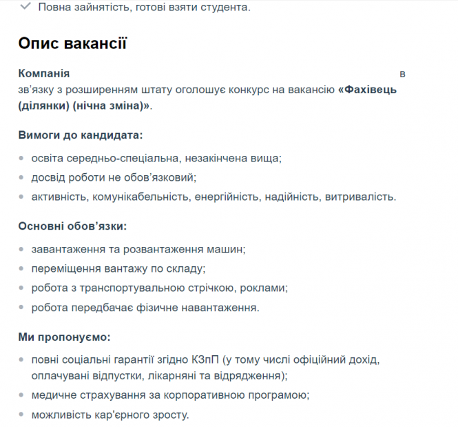 Зателефонувавши за номером в одній з вакансій, фахівець з відбору персоналу розповіла нам, що працевлаштування є офіційним. Окрім того, графік роботи є позмінним, а оплата праці погодинною.