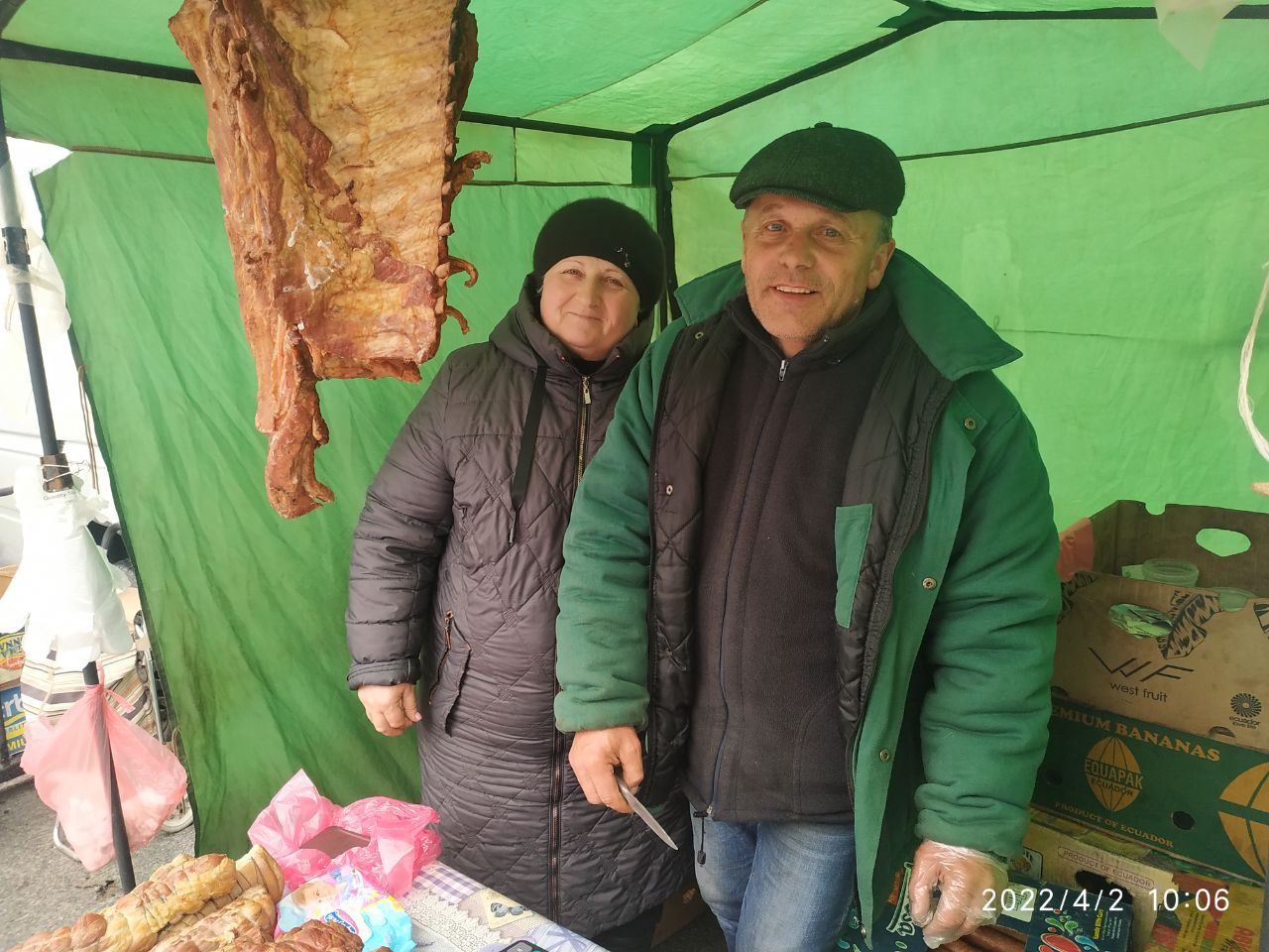 Чимало продавців приїхали з домашньою продукцією. Наприклад, пан Петро та пані Любов. Вони приїхали з Озерної. Продають м’ясні вироби: ковбаси, копчене м’ясо, ребра.