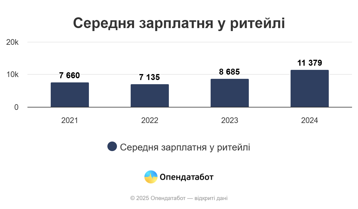 «11 379 гривень на місяць до оподаткування в середньому отримували працівники у сфері торгівлі в Україні торік. Це на третину більше, ніж у 2023 році — 8 685 грн, та майже у 1,5 раза більше, ніж до початку повномасштабної війни (7 660 грн). У перший рік великої війни, коли бізнес виживав, а не планував, зарплати навіть просіли — до 7 135 грн на місяць.»