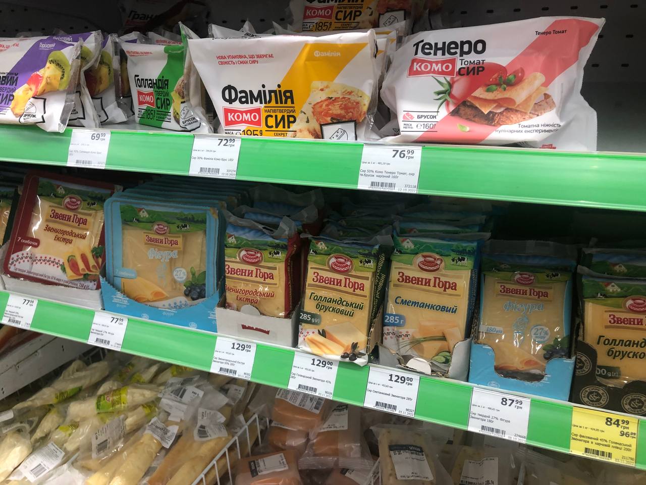 Звичайні тверді сири переважно українського виробника. 285г сиру «Звени Гора» коштує 129 гривень, 185г сиру «КОМО» – 72,99 гривень. Також є сир фета Premialle 230г – 60,99 гривень, а 153г натурального вершкового сиру Platnica з Польщі обійдеться у 42,99 гривень.
