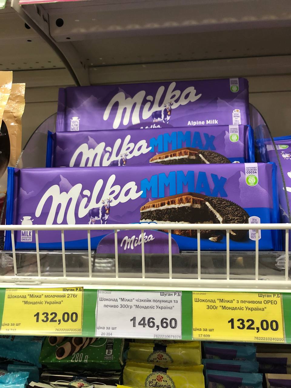 Жоден магазин не обходиться без солодощів. На полицях є білий, чорний, молочний шоколад. Є з начинками і без. Наприклад, ціна на польську Alpinella від 19 до 22 гривень. Велика Milka коштує від 95 до 112 гривень, є і за 120 гривень, але то з горіхами та карамеллю.
