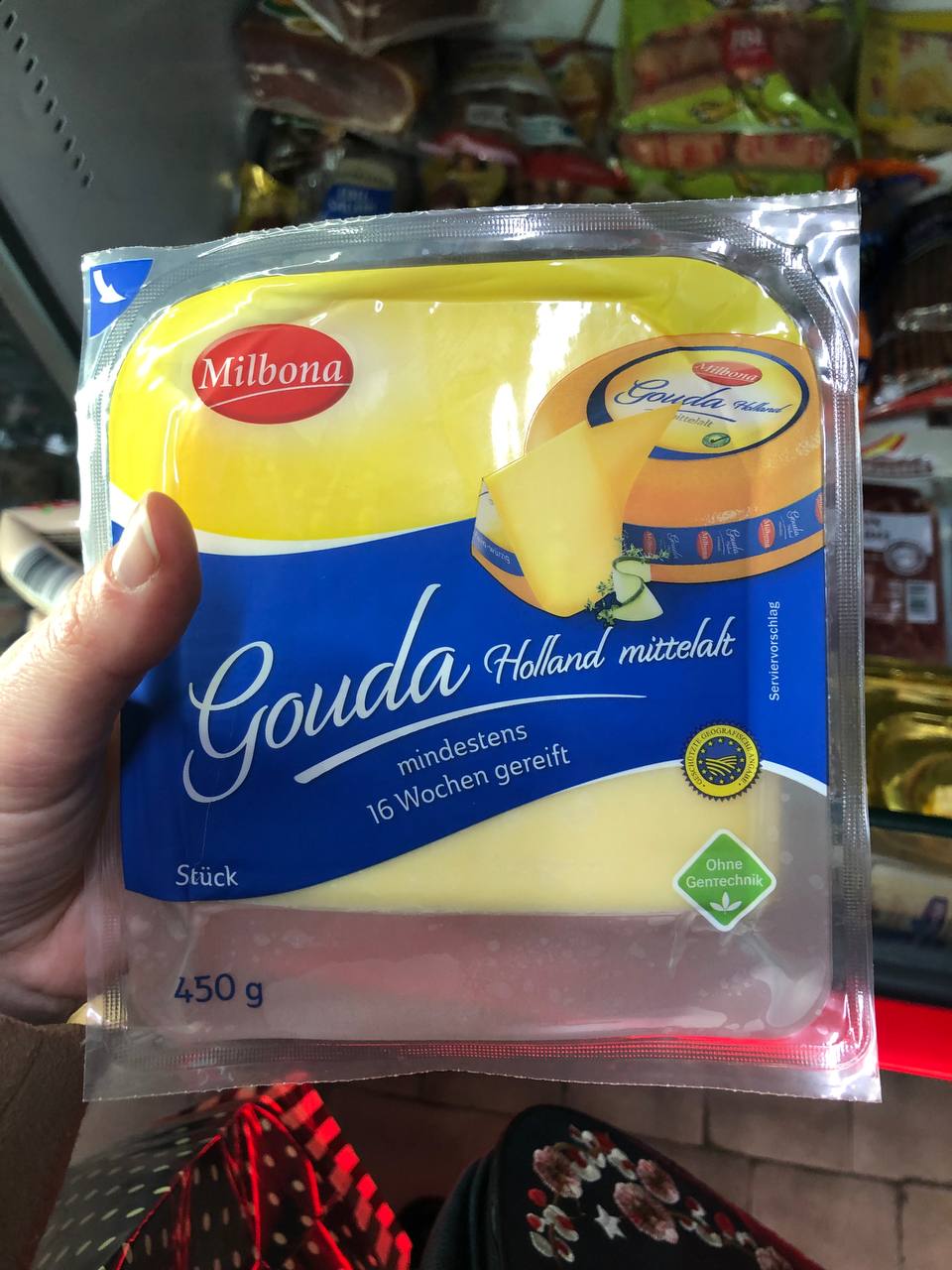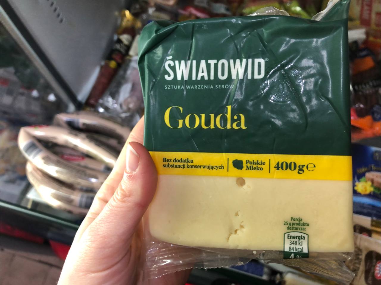 Перше дивимося ціни на сир. Наприклад, 450г німецького сиру Mіlbona коштує 250 гривень, а 400г польського Swiatowid – 125 гривень.