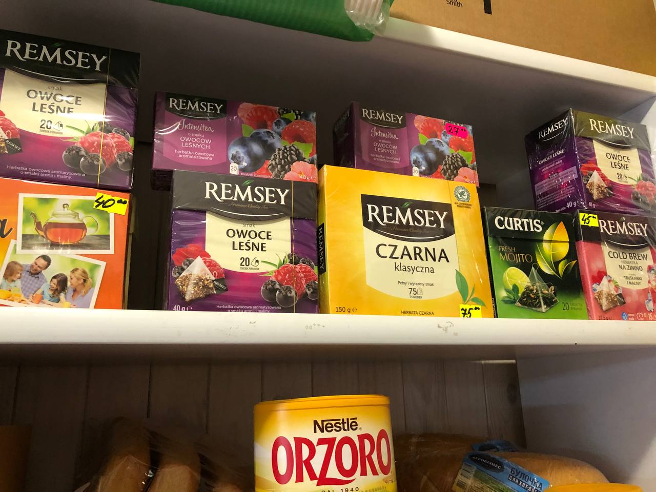 Полиці магазинів «Товари з Європи» переповнені різноманітною кавою та чаєм. Польський чай Remsey на 75 пакетиків коштує 75 гривень, а ось на 20 пакетиків від 27 до 45 гривень. Також польський чай Рossti на 80г коштує 25 гривень, а 100г фруктово-трав’яного Bastek – 43 гривні.