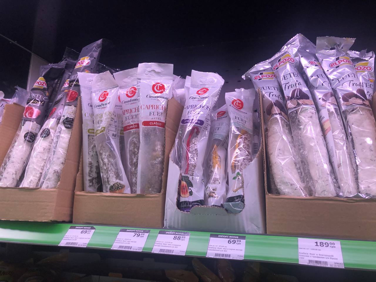 80г іспанської ковбаси Casademont з інжиром коштує 88,99 гривень, а 170г іспанської ковбаси Elpozo – 189 гривень.