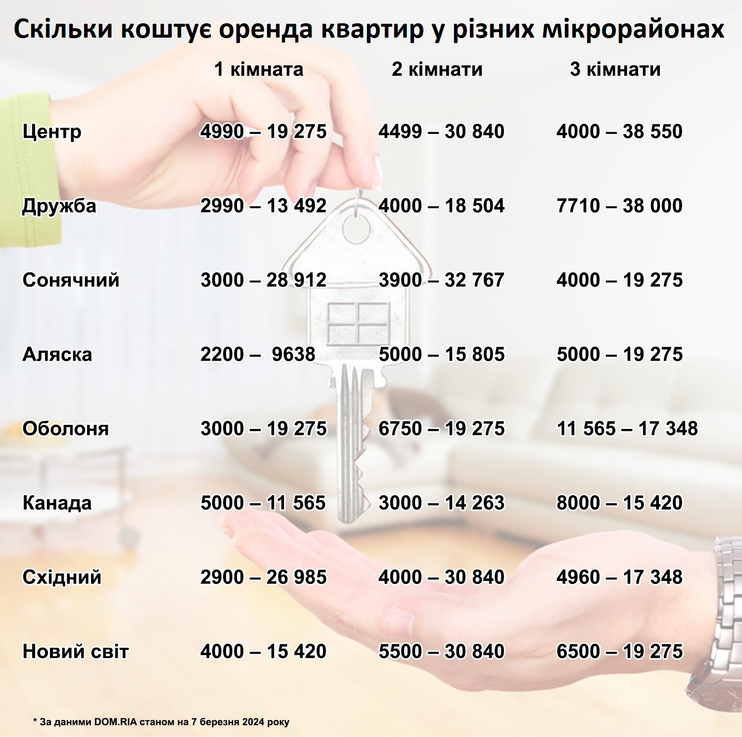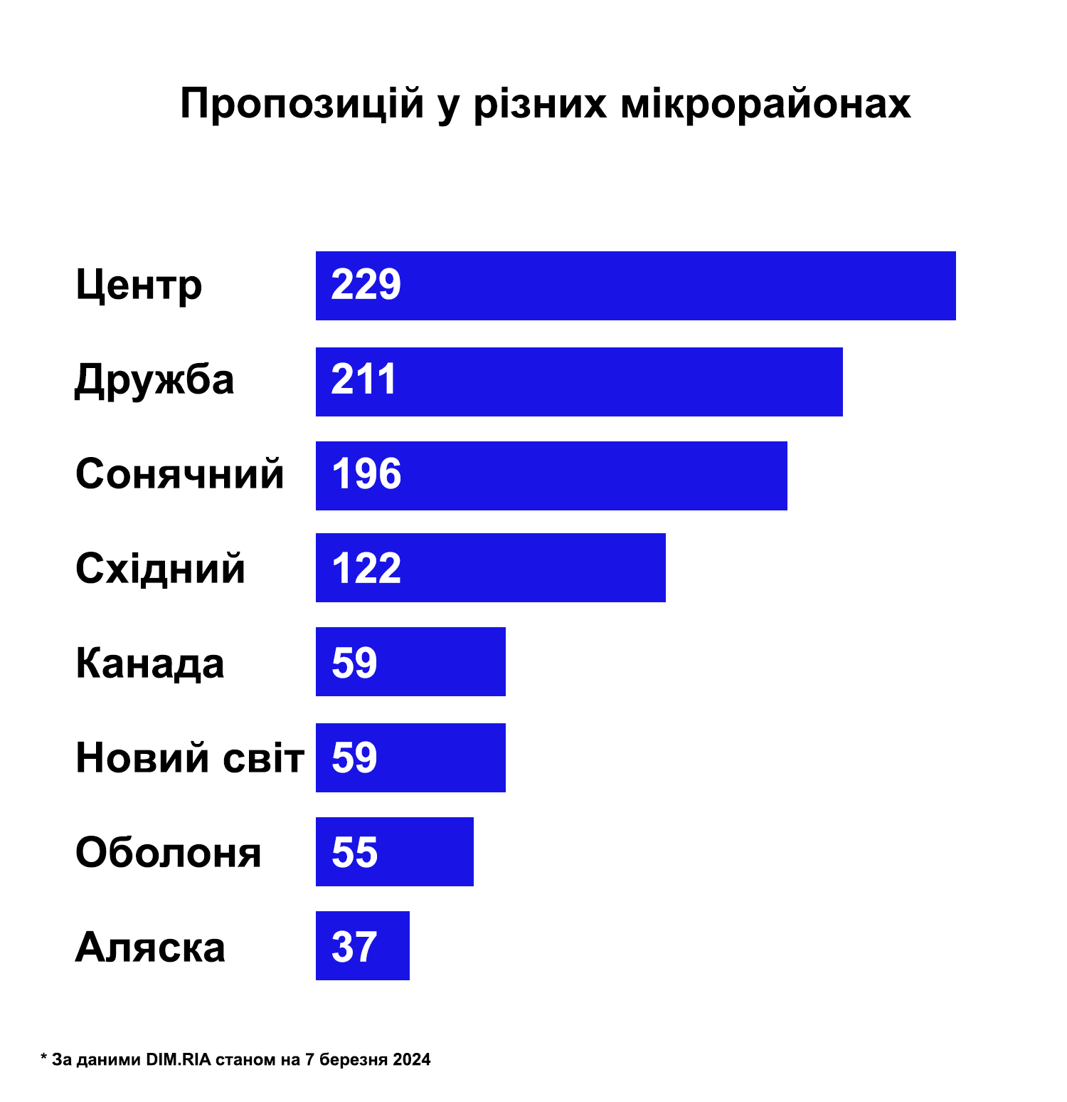 Серед розташування – найбільше квартир здають в оренду є у мікрорайоні «Центр». Однак зауважимо, що деякі власники та ріелтори вказують неправильне розташування житла. Наприклад, квартиру, яка розташована на вулиці Торговиця (мікрорайон Оболоня), вказують, що вона у центрі міста. Тож треба бути уважним при виборі квартири та перевіряти фактичне розташування житла.