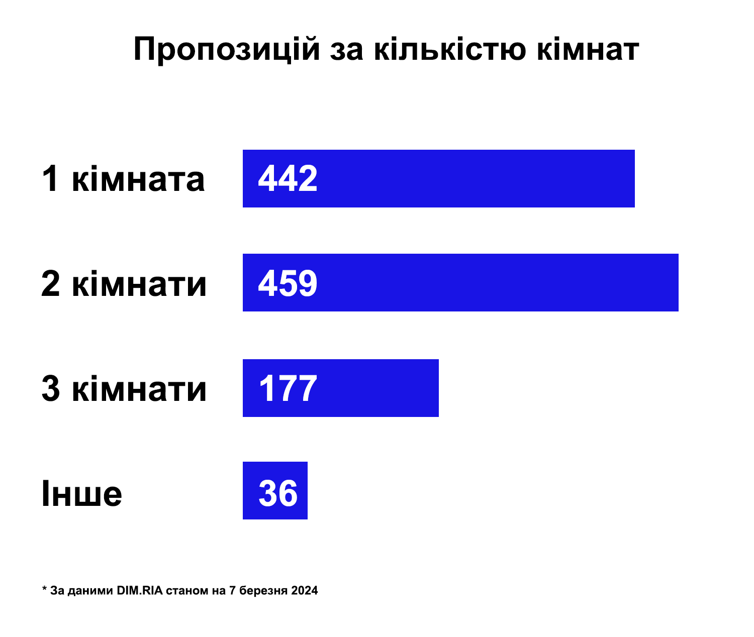Найбільше доступно двокімнатних квартир. На другому місці – пропозиції однокімнатних квартир.
